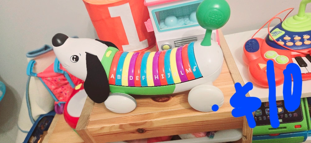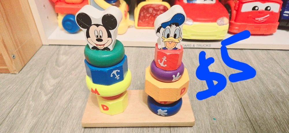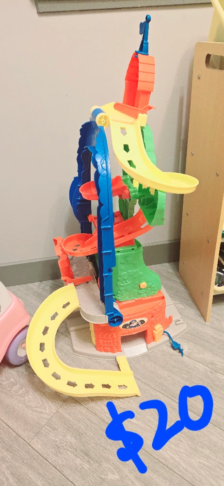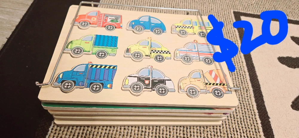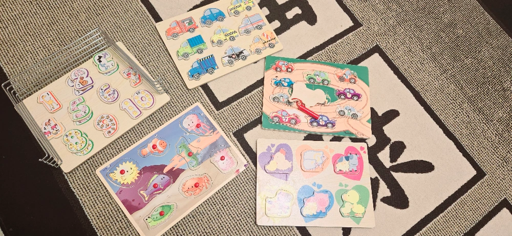 Bundle of children's toys includes a colourful multi-level car track, several wooden puzzles featuring vehicles, numbers and animals, a wooden block set on wheels, and an alphabet dog toy. Great for imaginative play and early learning. Some minor wear and tear expected from use.