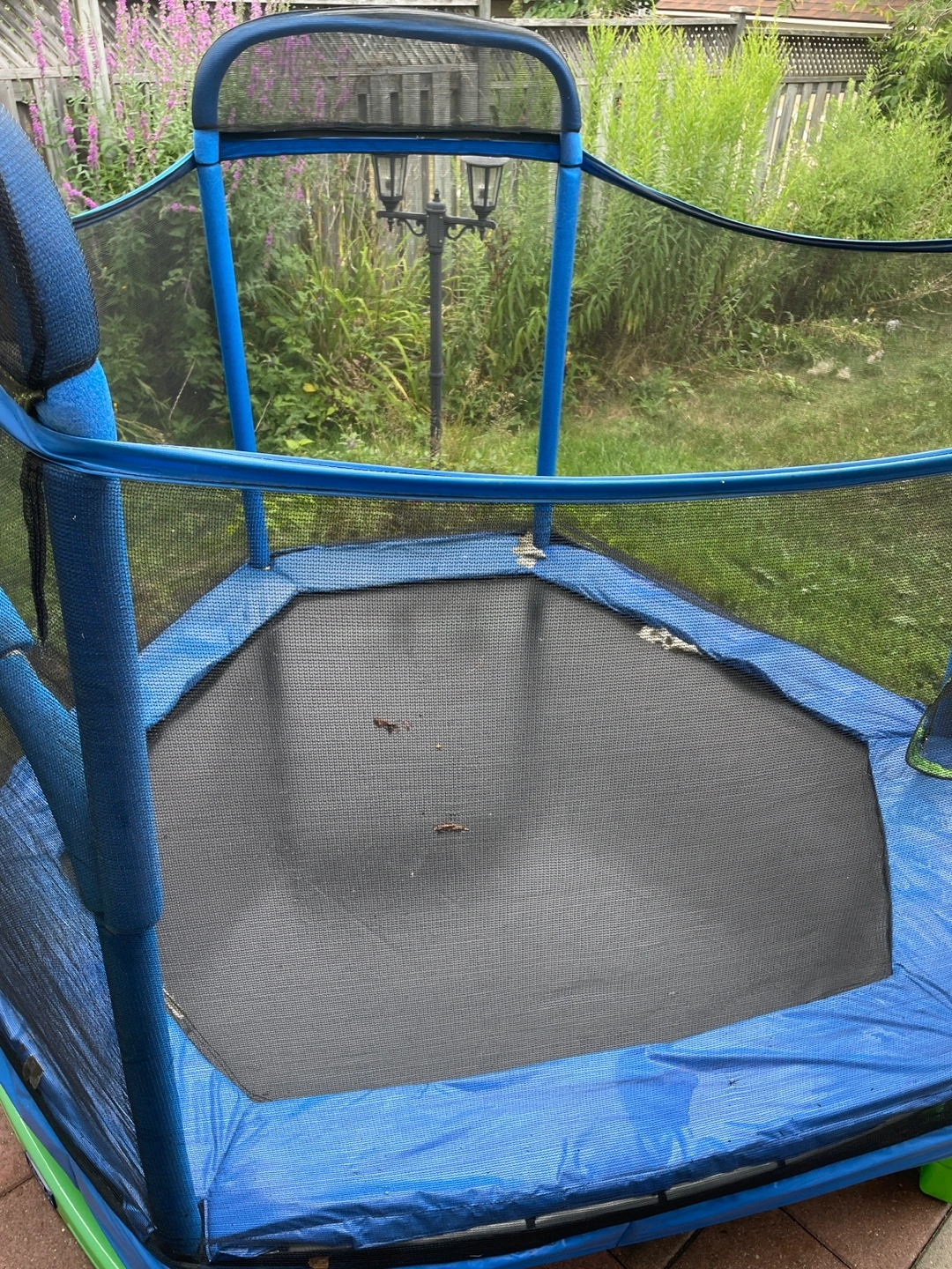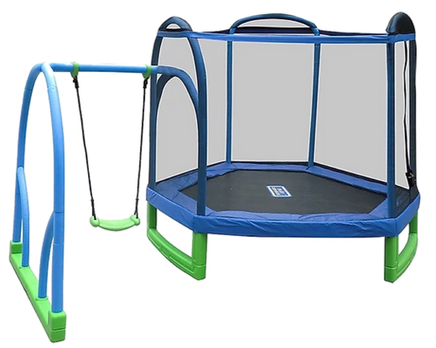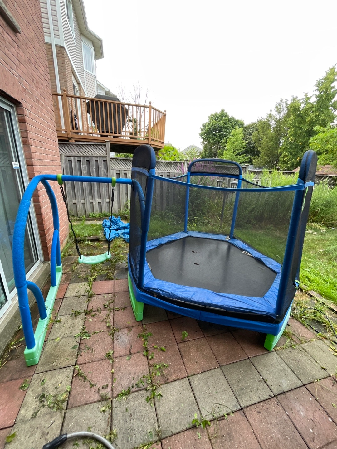 This trampoline and swing set is perfect for kids to have fun and exercise! It features a trampoline with a safety net enclosure and a swing set attached to the side. Originally bought for $289. Great for backyard fun! Buyer responsible for disassembly and transportation. I am willing to disassemble if payment is made first. https://www.sportspowerltd.net/product-page/my-first-jump-n-swing