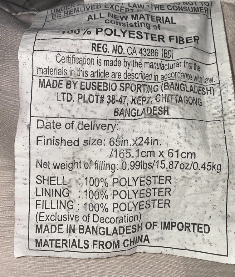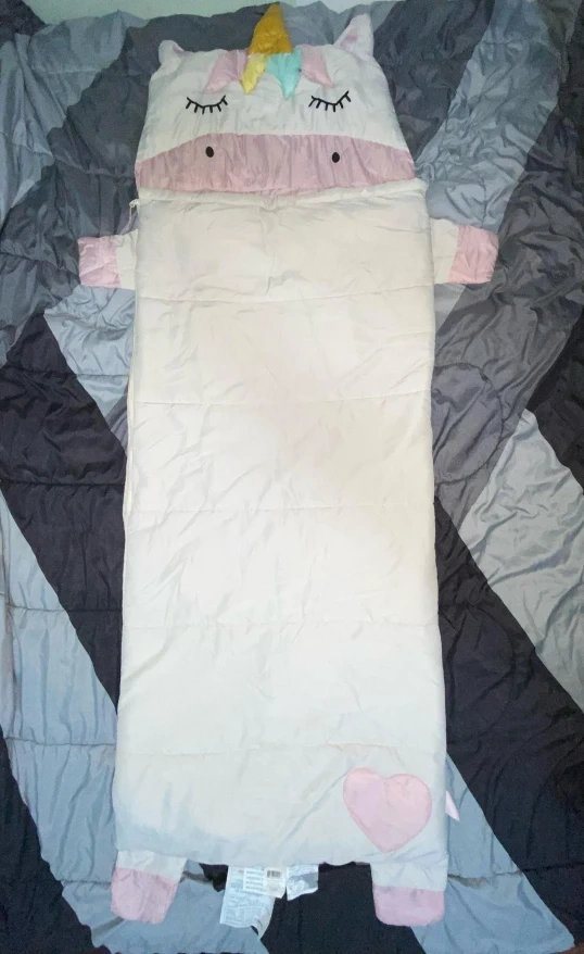 Adorable unicorn sleeping bag. Pink and white. Polyester filling. Great for sleepovers or camping. Measures approximately 65in x 24in.