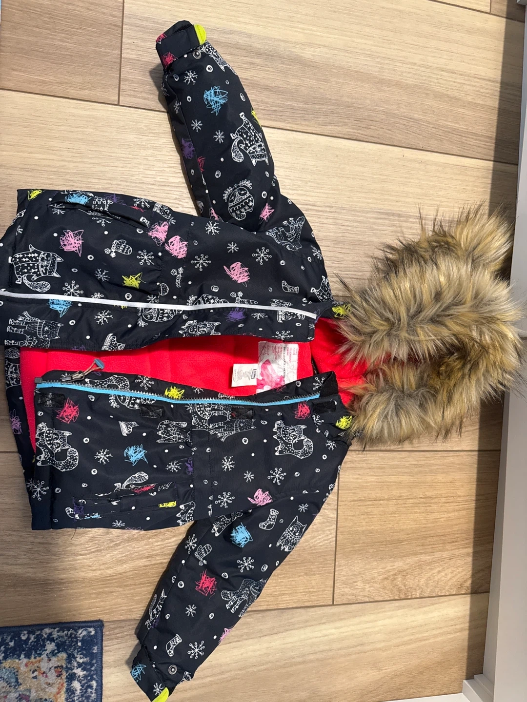 A cozy winter jacket for kids, perfect for the cold Canadian weather! It features a fun pattern with animals and snowflakes, and a warm fur hood to keep your little one snug. The jacket is in great condition and ready for a new home!