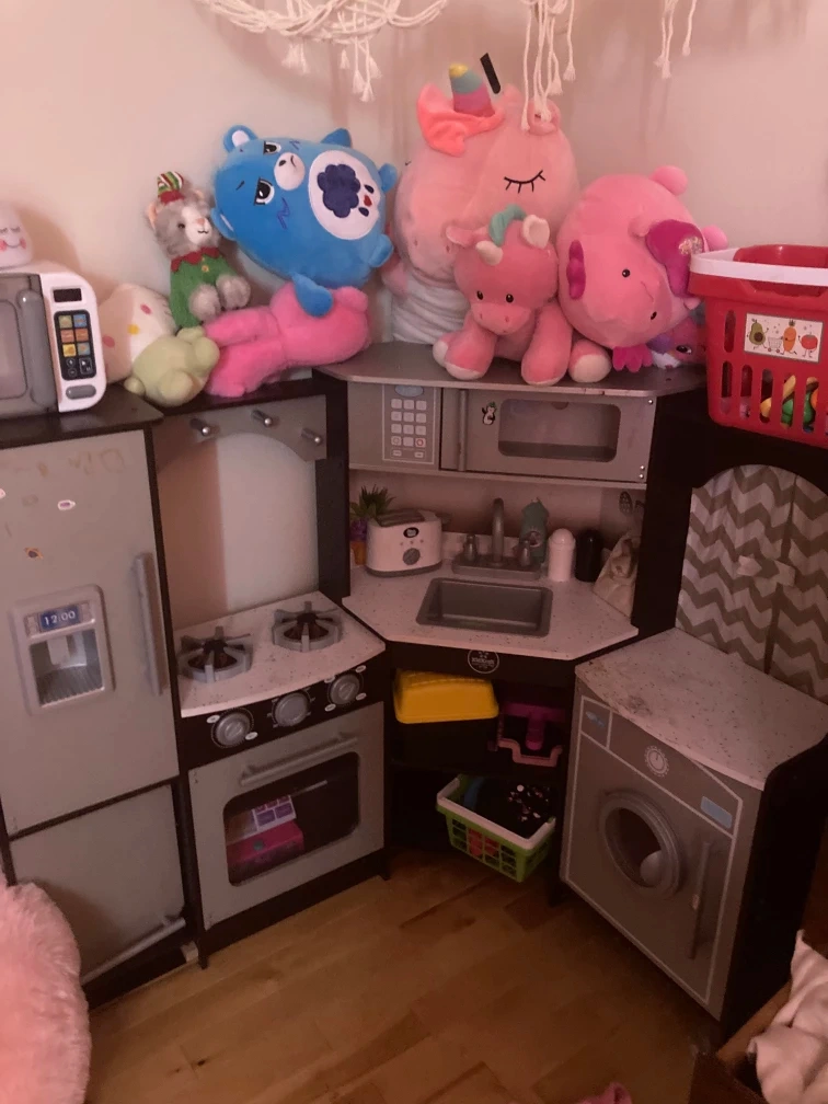 Selling a wooden play kitchen set for kids. It includes a fridge, stove, oven, sink, and washing machine. Great for imaginative play!