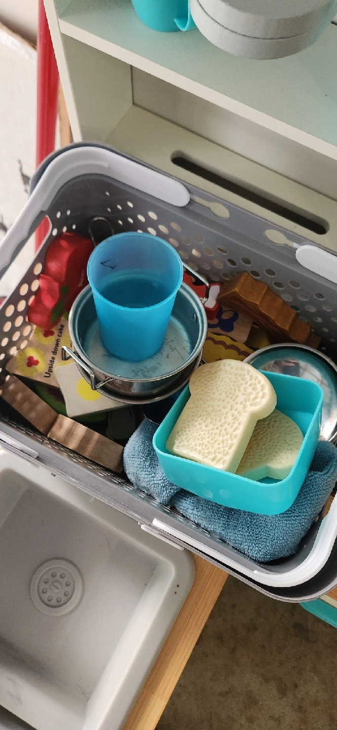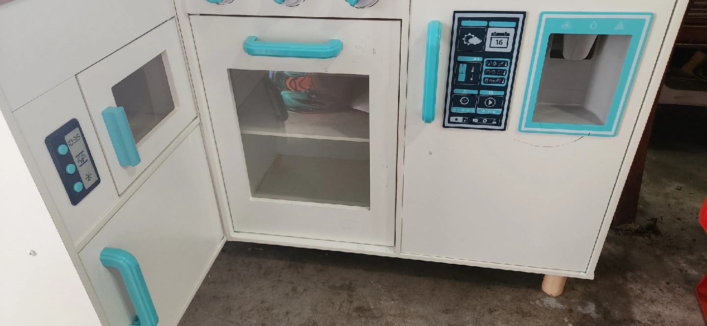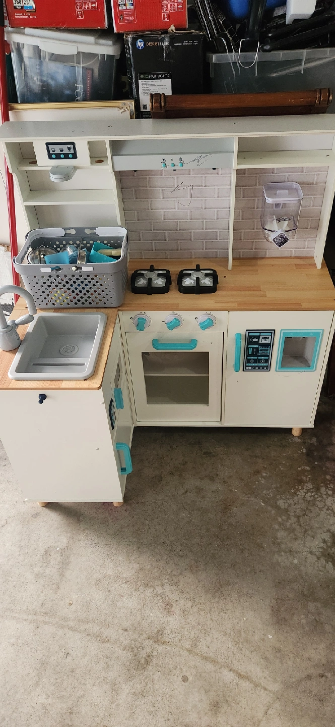 Selling a cute wooden play kitchen for kids! It comes with a sink, oven, stovetop, and even a water dispenser. There are also some play food items and kitchen accessories included, so your little one can start cooking right away! It's in good condition and ready for a new home