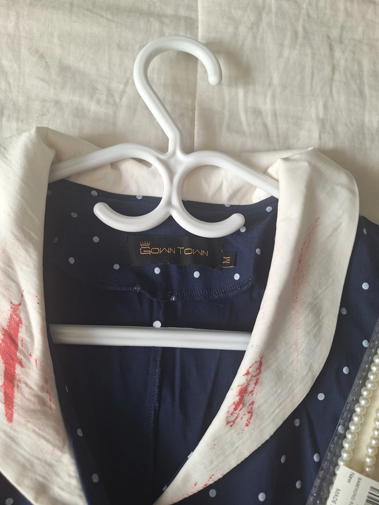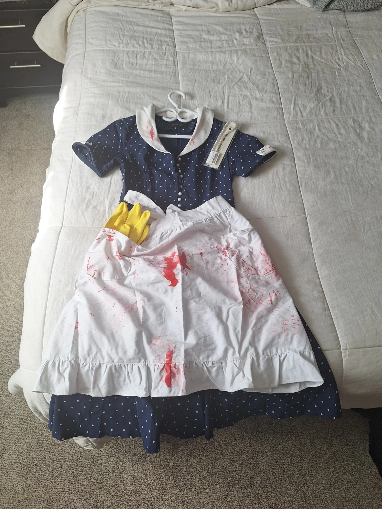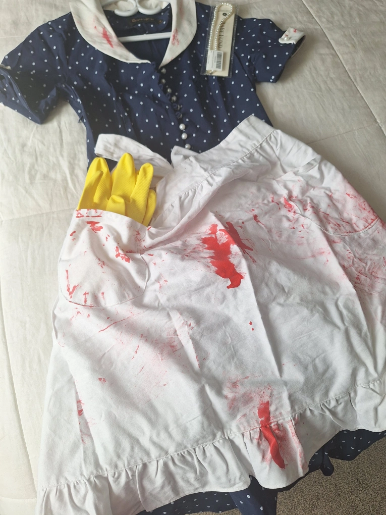 Homemade. Was a hit at the party! lol Worn once. includes: Dress Bloody Apron Yellow gloves Pearl Necklace I also have a blue Underlay for $10 if you'd like a little poof underneath. I also carried around a fake knife lol