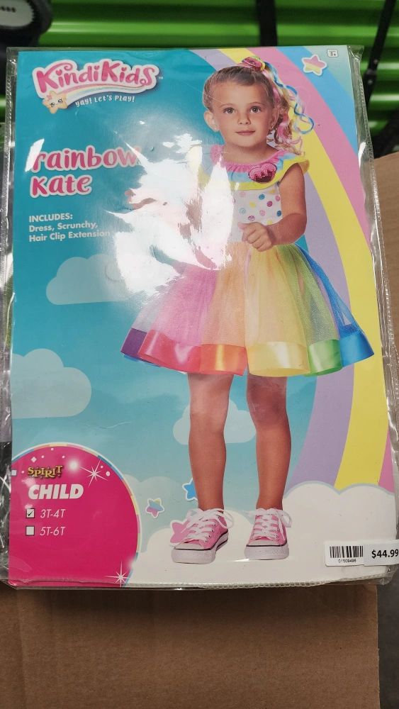 Selling a Kindi Kids Rainbow Kate costume in size 3T-4T! This adorable costume includes a dress, scrunchy, and hair clip extension. Your little one will love dressing up as Rainbow Kate!