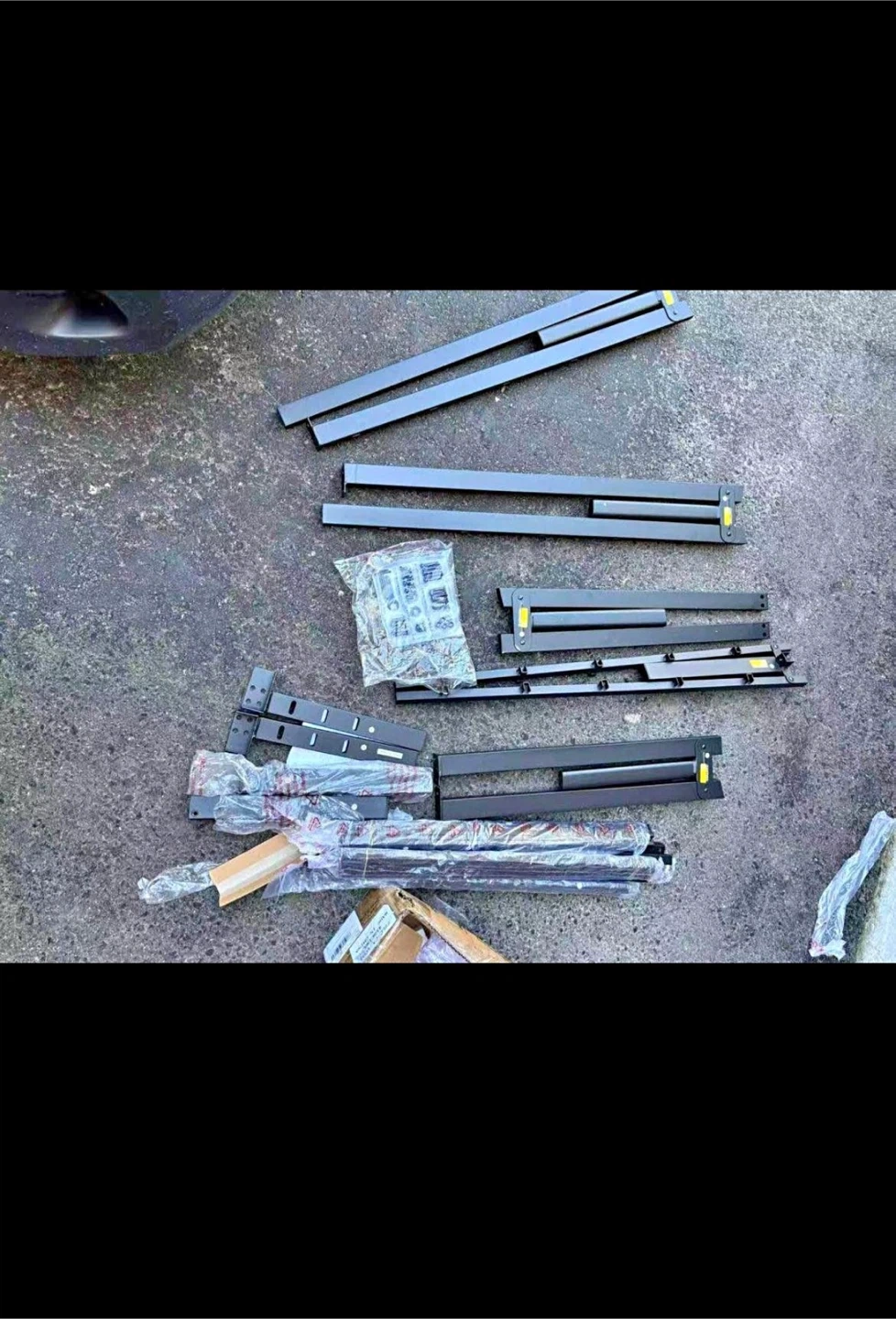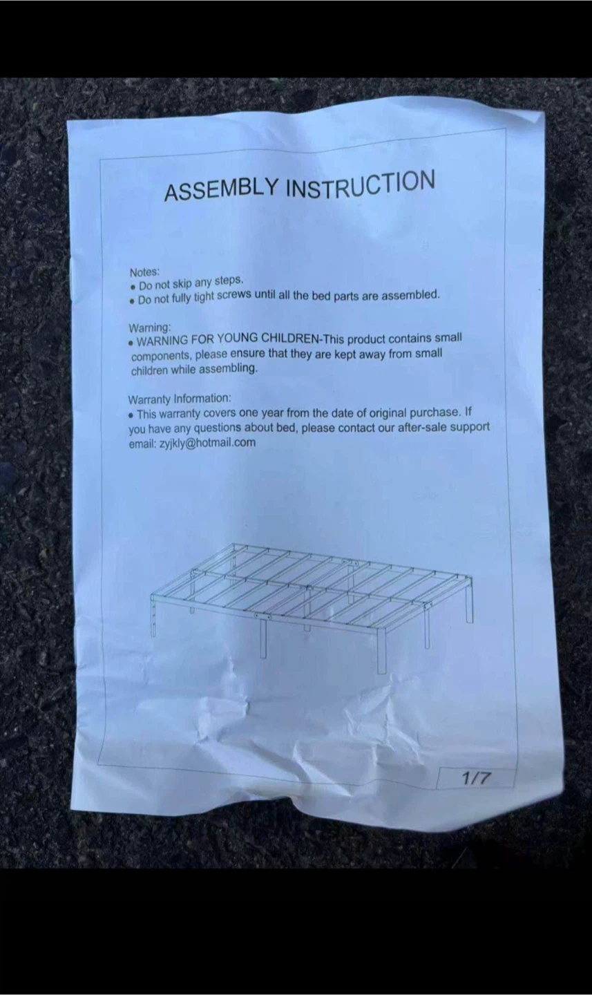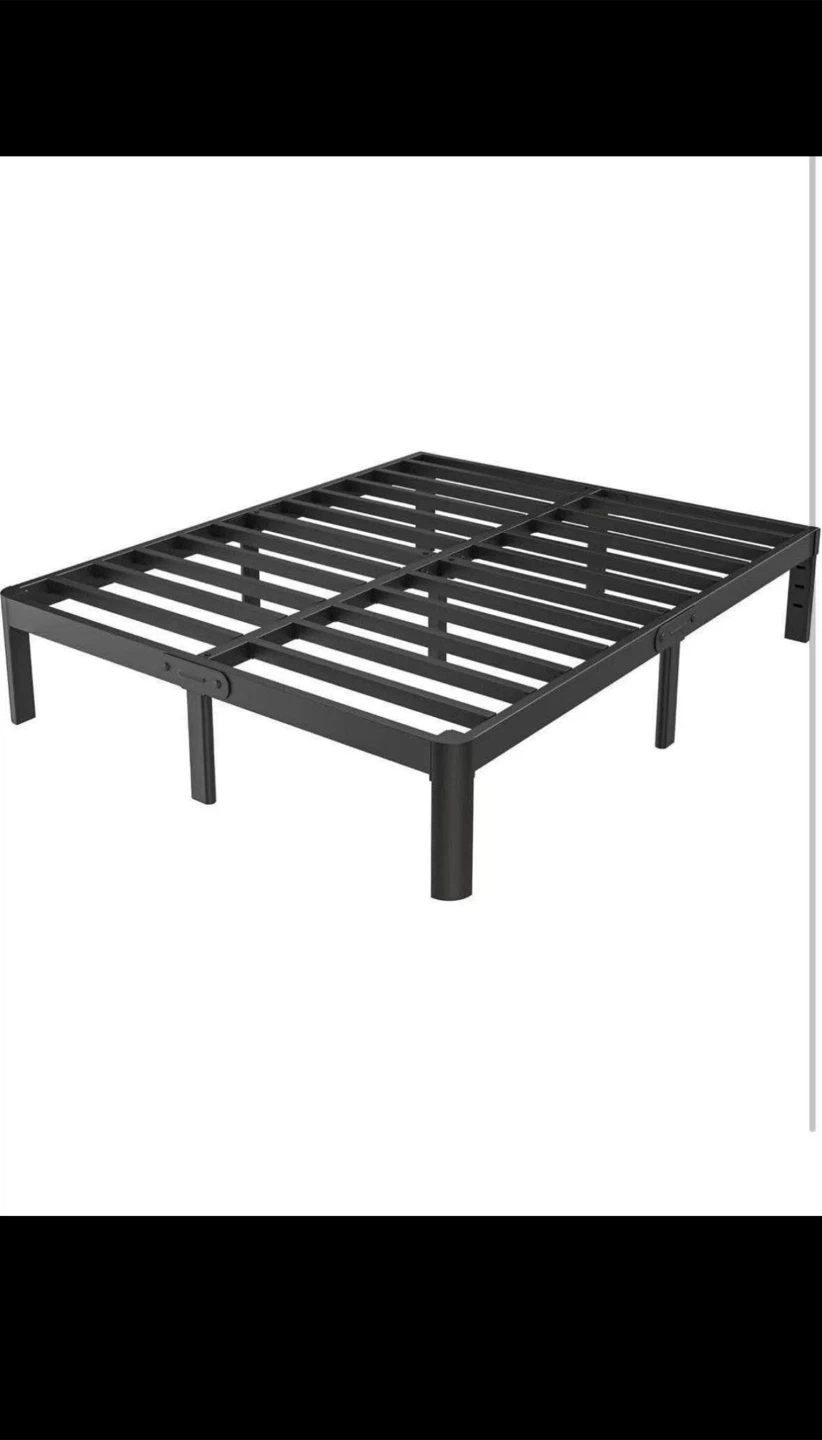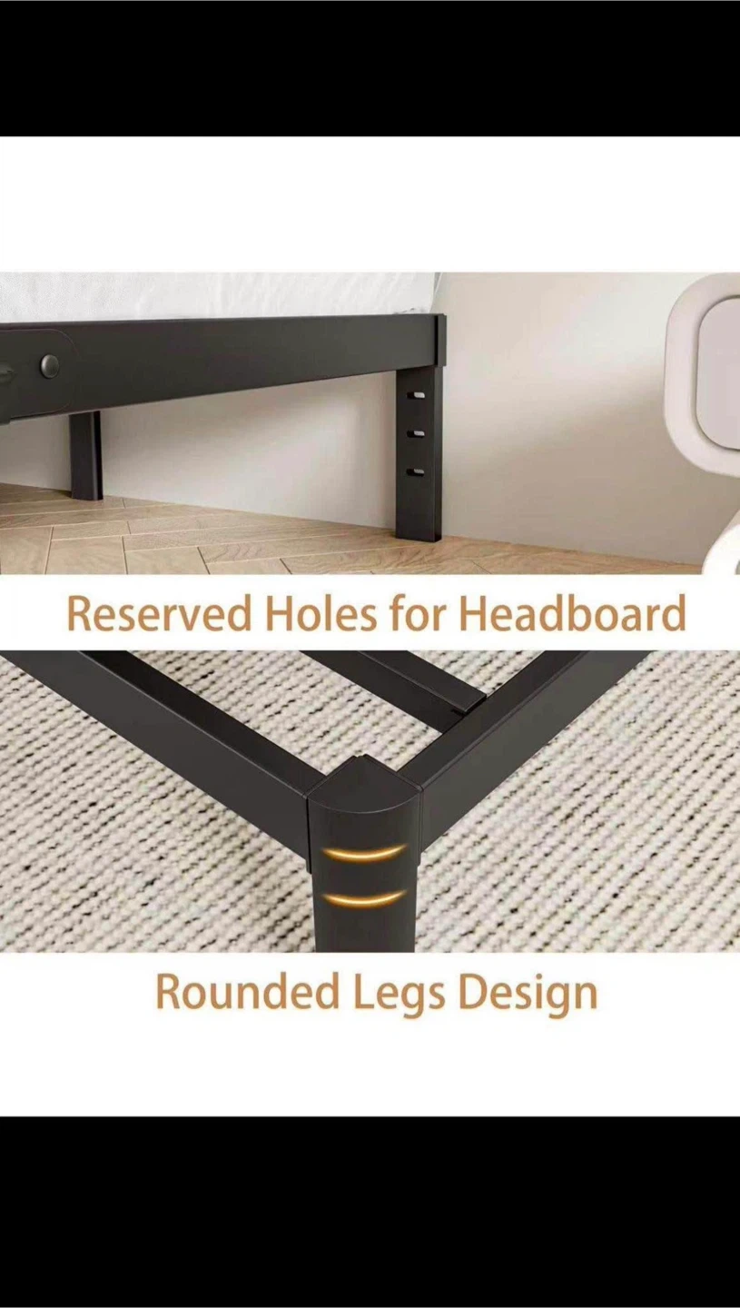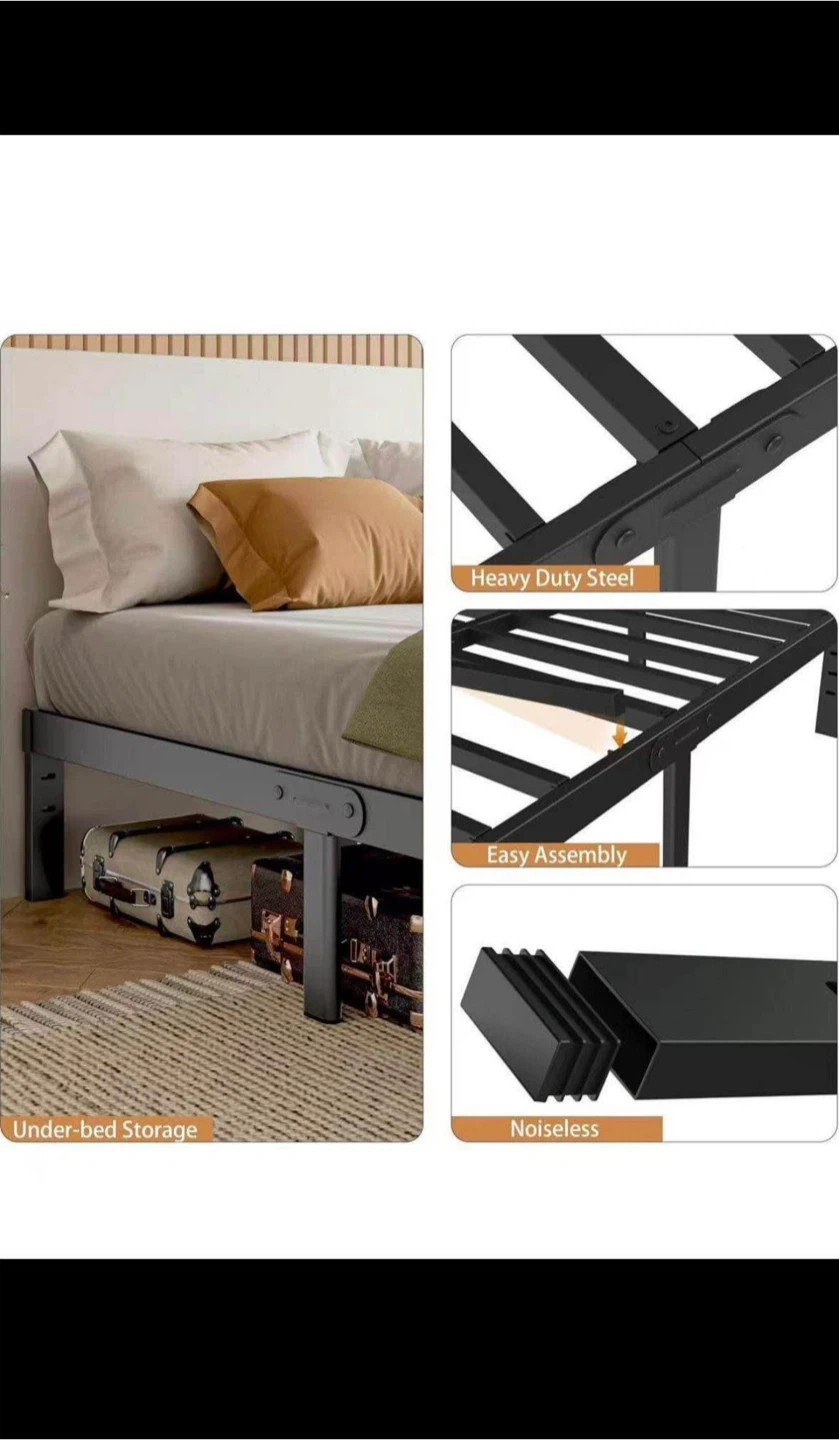 Selling a king bed frame made with heavy-duty steel! It's designed for easy assembly and is also noiseless. The frame has reserved holes for a headboard and features a rounded legs design. Plus, there's under-bed storage space!