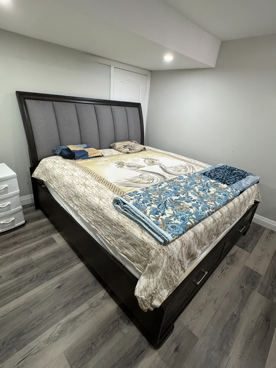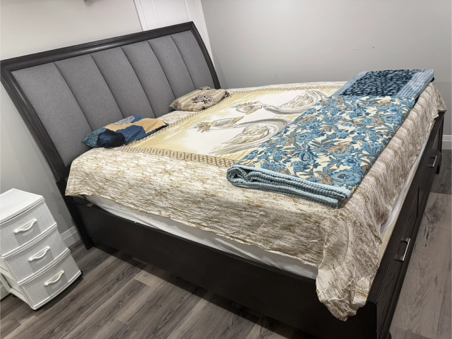 Selling a king size bed frame with a stylish headboard. It's in great condition and ready for a new home. The bed frame has a dark finish and the headboard is upholstered in a neutral grey fabric. Perfect for adding a touch of elegance to your bedroom! Can disassemble the parts