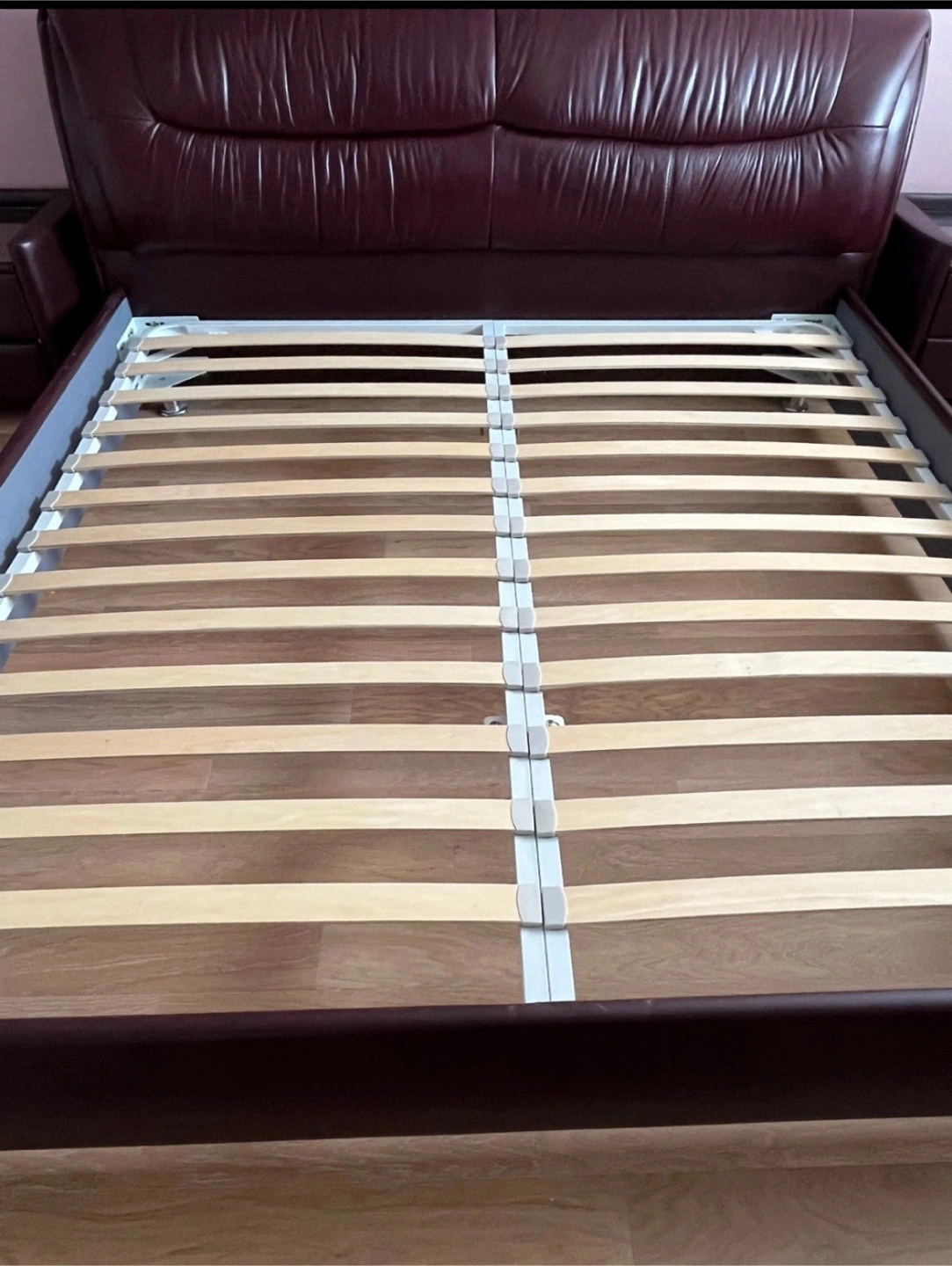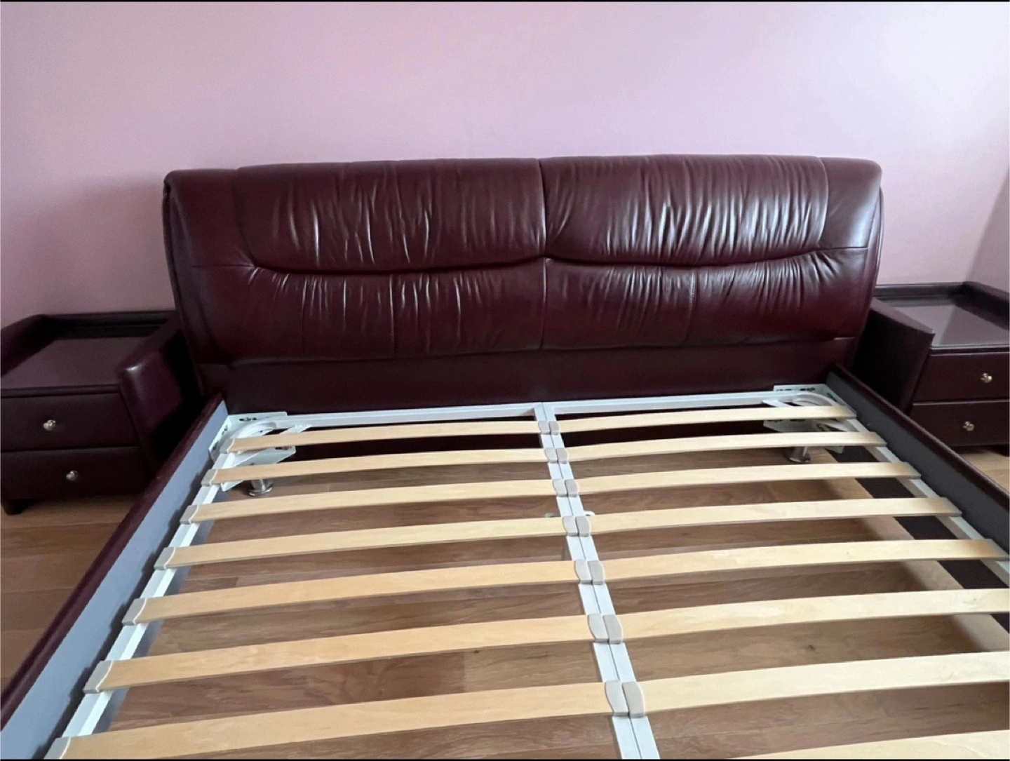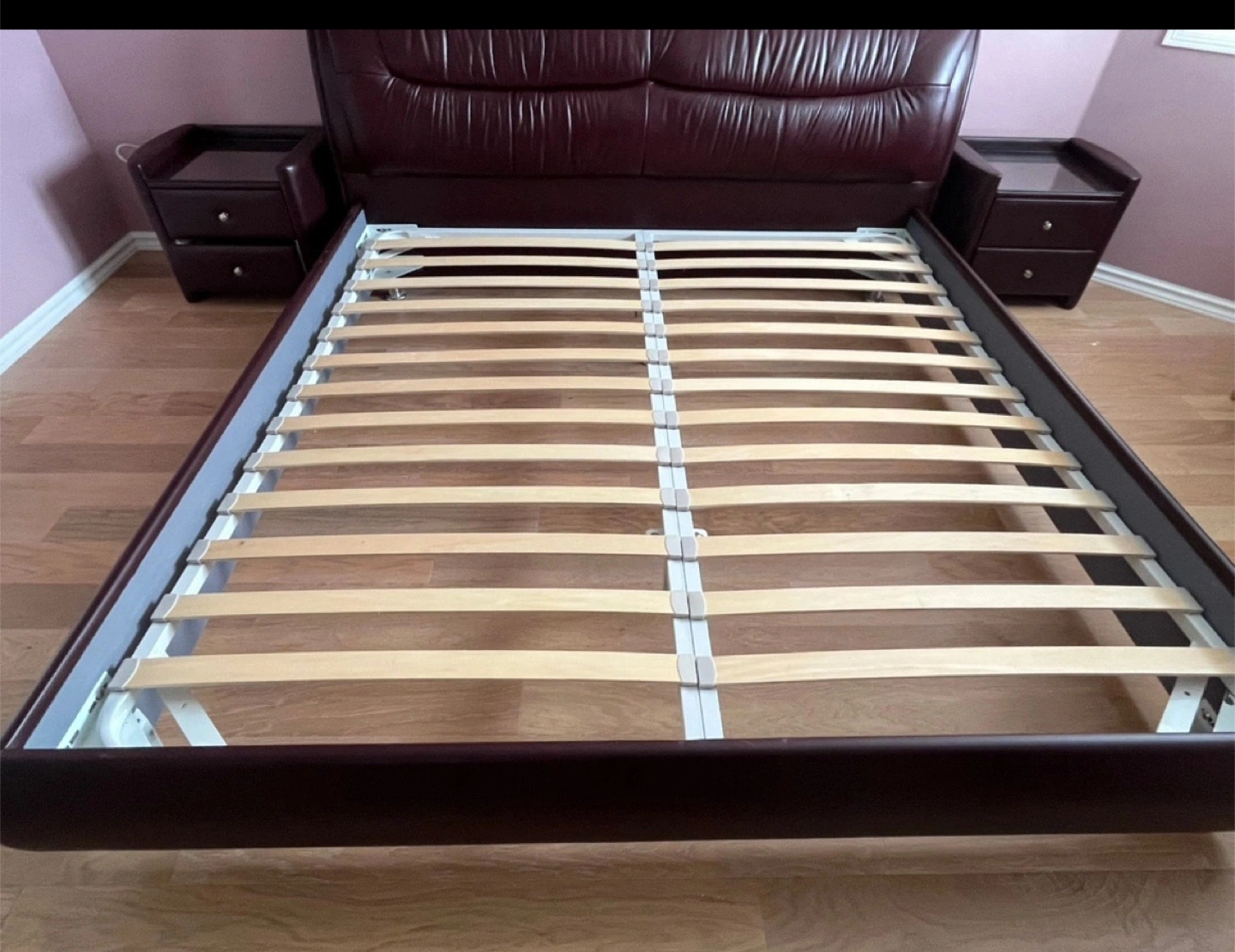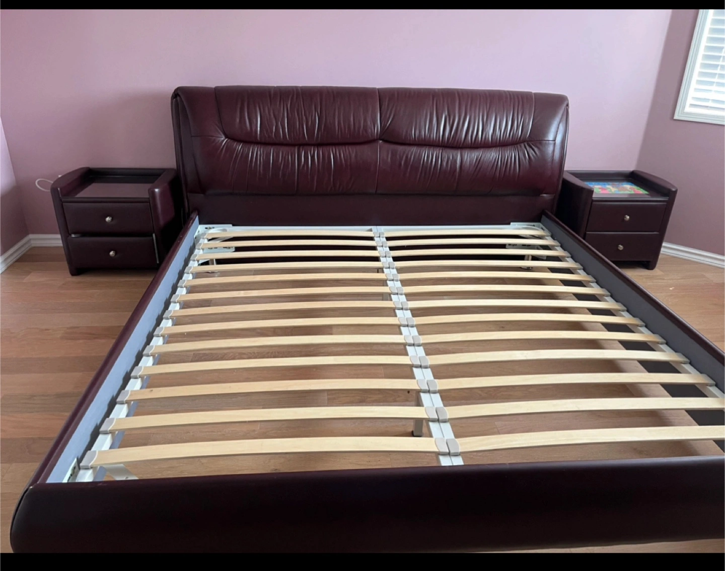 Selling a burgundy leather bed frame, comes with two matching side tables. The bed frame is in good condition and would be a great addition to any bedroom! Feel free to message me if you have any questions or want to arrange a viewing King size bed frame with 2 2-drawer nightstands. It’s not included mattress Leather headboard