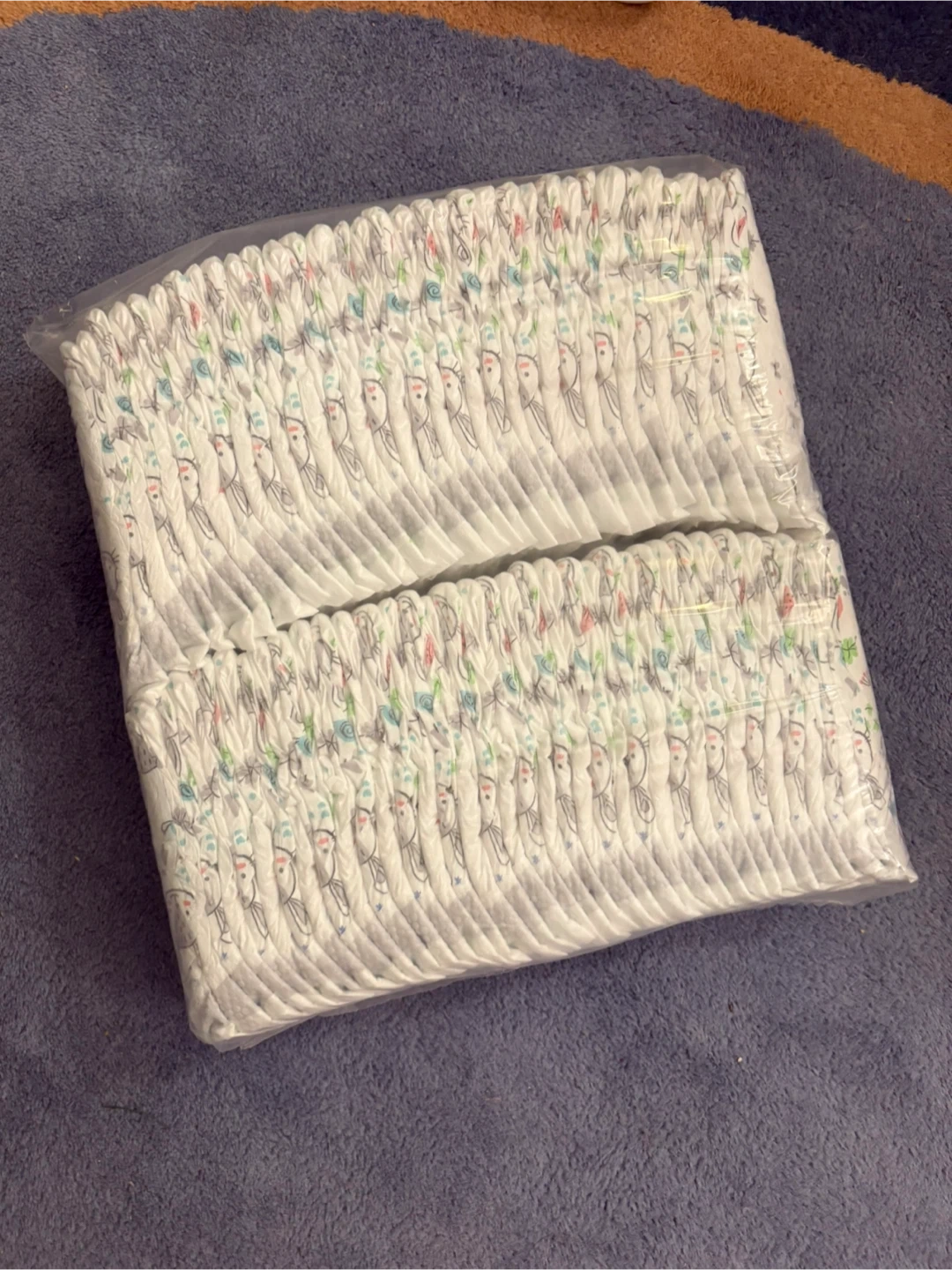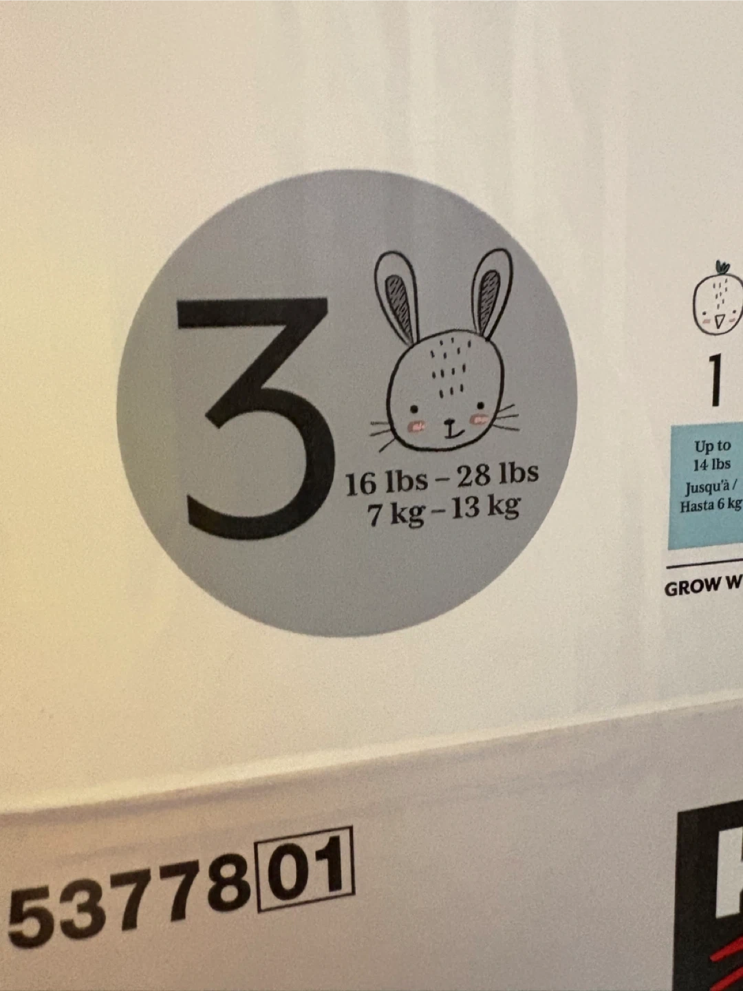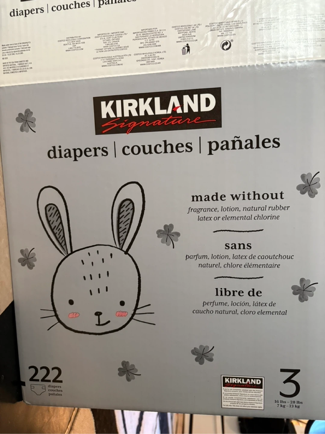 Selling a pack of Kirkland Signature diapers, size 3. 74 pieces. These are designed for babies weighing between 16 and 28 lbs (7 kg - 13 kg).