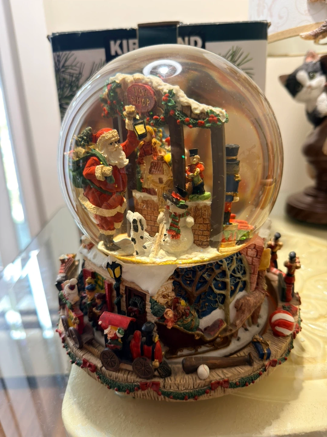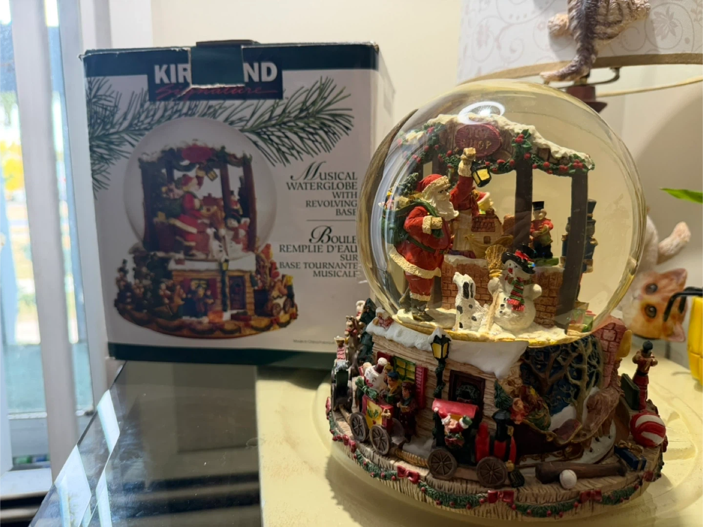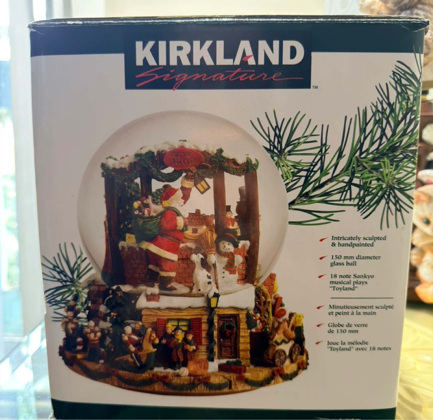 Selling a Kirkland Signature musical waterglobe with a revolving base! It's intricately sculpted and handpainted. The globe is 150 mm in diameter and made of glass. It plays 18 notes of the Sankyo musical play "Toyland", and it comes with the original box. Only available for pick up