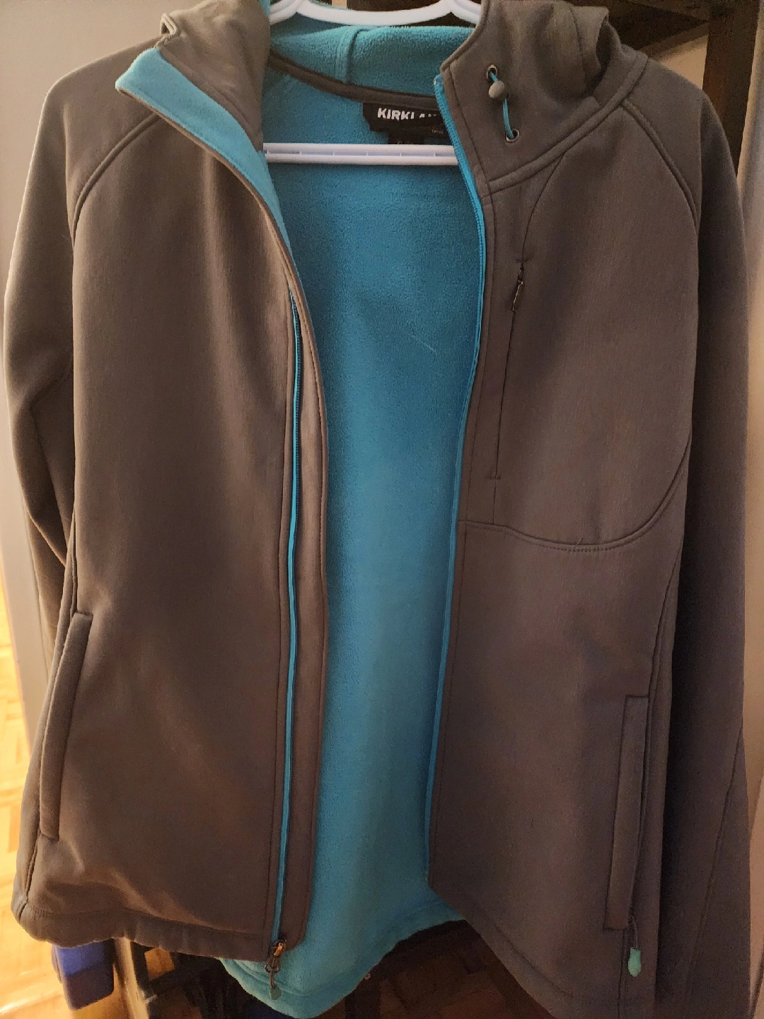 Cozy Kirkland softshell jacket, perfect for layering! It's an XL and features a hood and handy pockets. The outer colour is a neutral grey, while the inside is a bright turquoise.