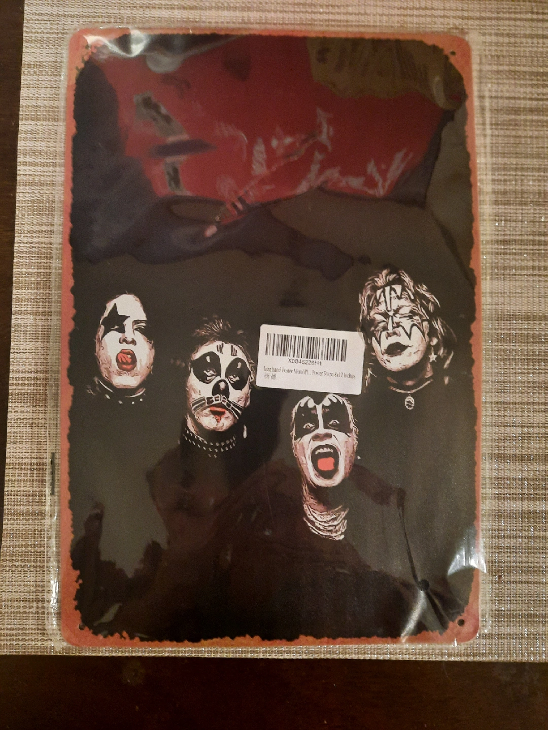 Selling a KISS band poster made of metal. It's a retro style poster with dimensions of 8x12 inches