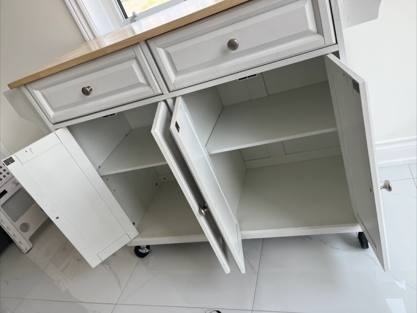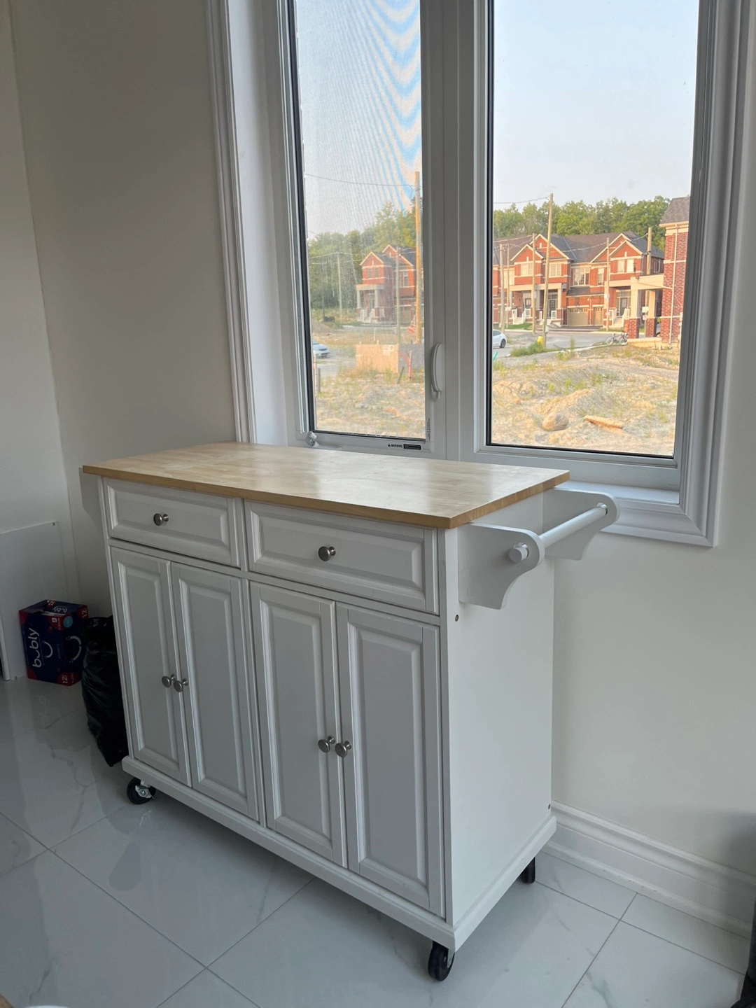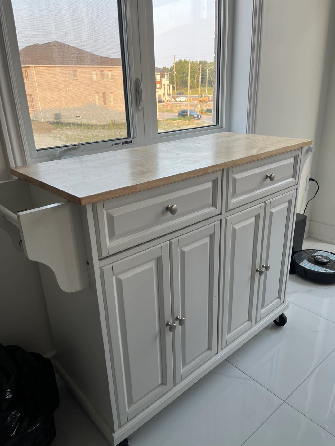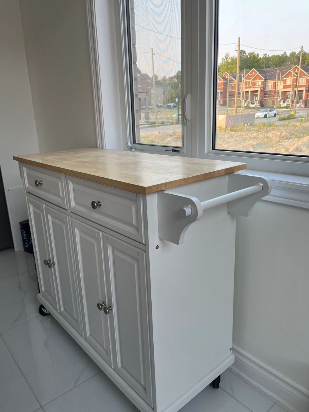 Selling a kitchen island cart in great condition! It features a butcher block top and white cabinets with drawers and doors. It also has a towel bar on the side and sits on wheels for easy moving. Perfect for adding extra storage and counter space to your kitchen