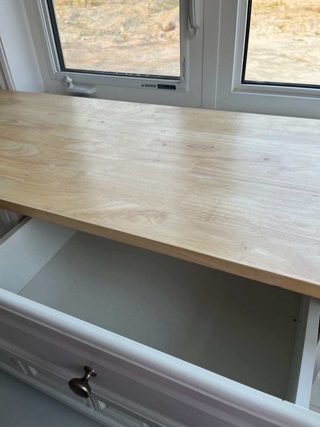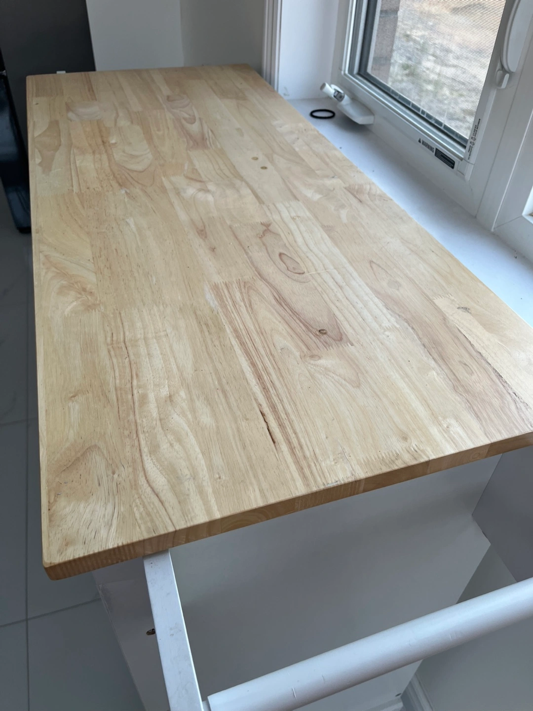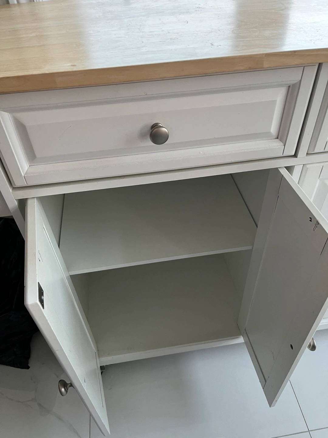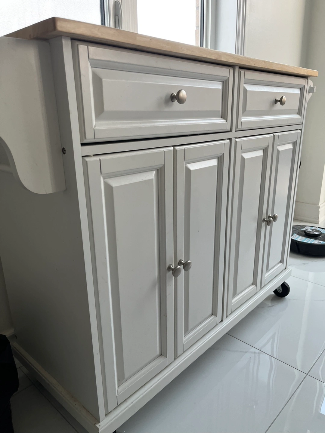 Selling a kitchen island cart in great condition! It features a butcher block top and white cabinets with drawers and doors. It also has a towel bar on the side and sits on wheels for easy moving. Perfect for adding extra storage and counter space to your kitchen