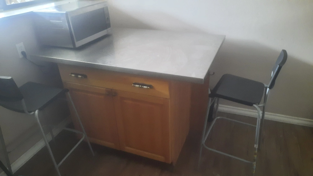 Selling a kitchen island with a stainless steel top and wooden cabinet. It comes with two bar stools, perfect for a small kitchen or dining area! The stools have a simple, modern design with black seats and silver frames