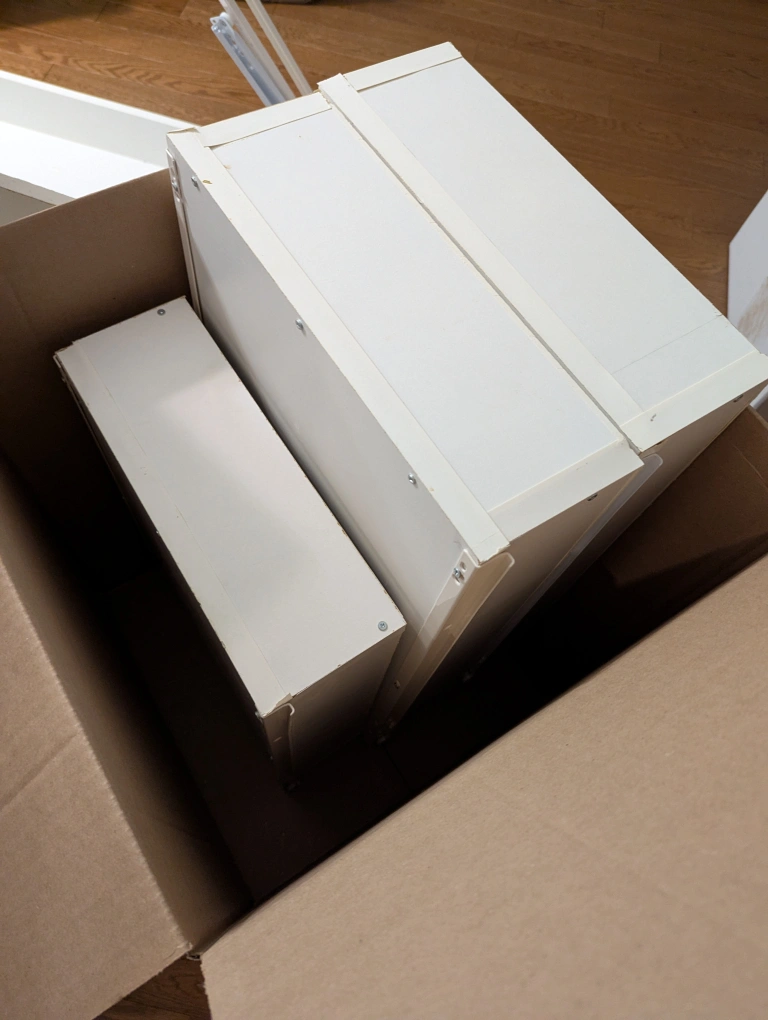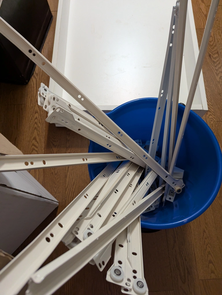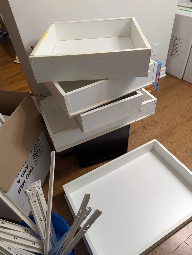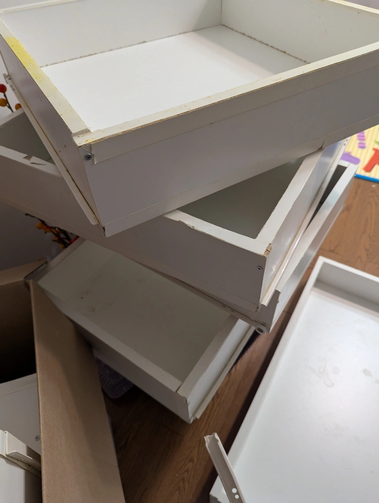 Selling a set of white drawers, taken out from a kitchen. They're in fair condition and ready for a new home. Includes the drawer slides. dimensions: 4 drawers of size 14.4" w x 26" d 2 drawers of size 29" w x 20" d 2 drawers of size 19.5 " w x 20" d 2 drawers of size 13.5" w x 20"d