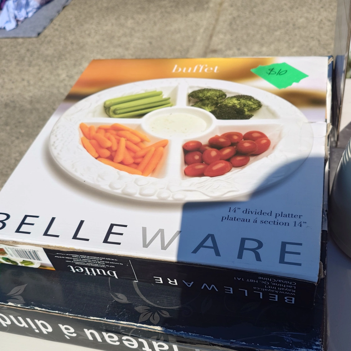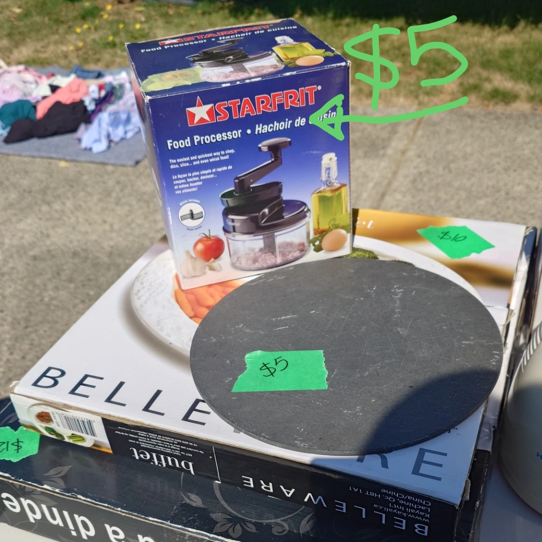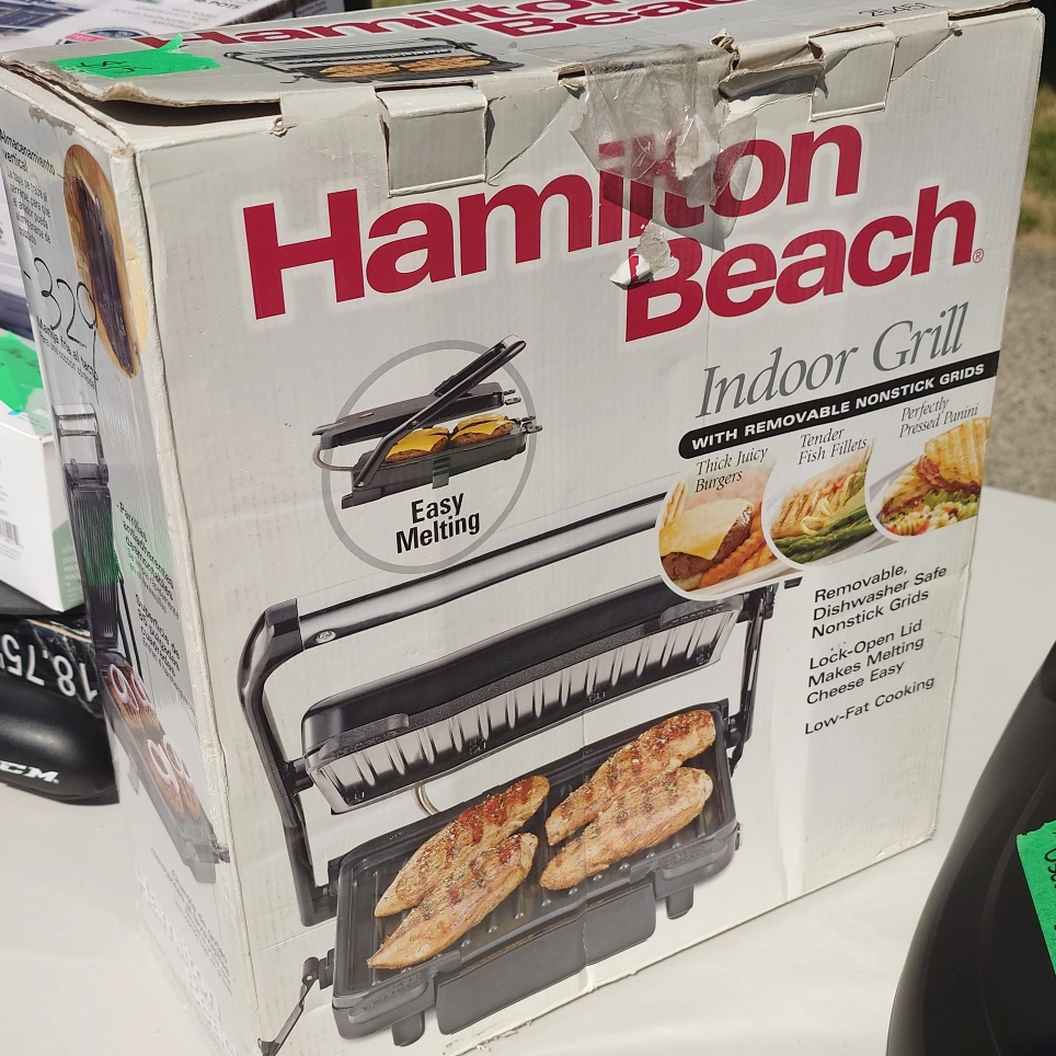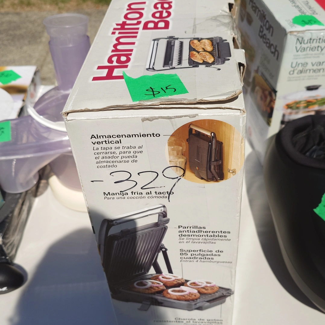 - Hamilton Beach indoor grill: It features removable, dishwasher-safe nonstick grids and a lock-open lid for easy, low-fat cooking. Perfect for thick, juicy burgers, tender fish fillets, and perfectly pressed panini. - Hamilton Beach original steamer: great for when all those stove burners are busy but you need some steaming to get done as well! - Round Stone cutting board - Food processors (both electric and hand operated available) - Divided platter 14” - Turkey serving platter 18.75” Prices marked in the photos. Ask if you are unsure. From a No pet No smoke home. pick up only.