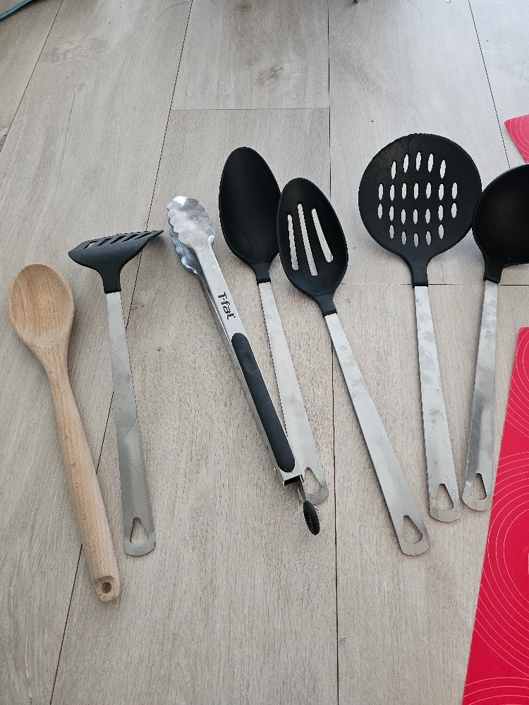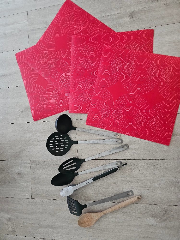 A selection of kitchen tools, including a ladle, slotted spoon, turner, tongs, and wooden spoon. There are also red placemats. You will love preparing a fresh meal with these items.