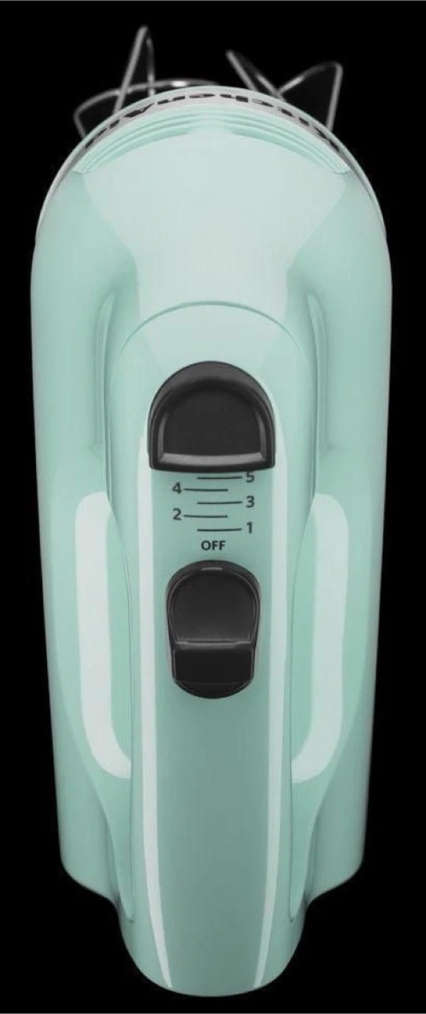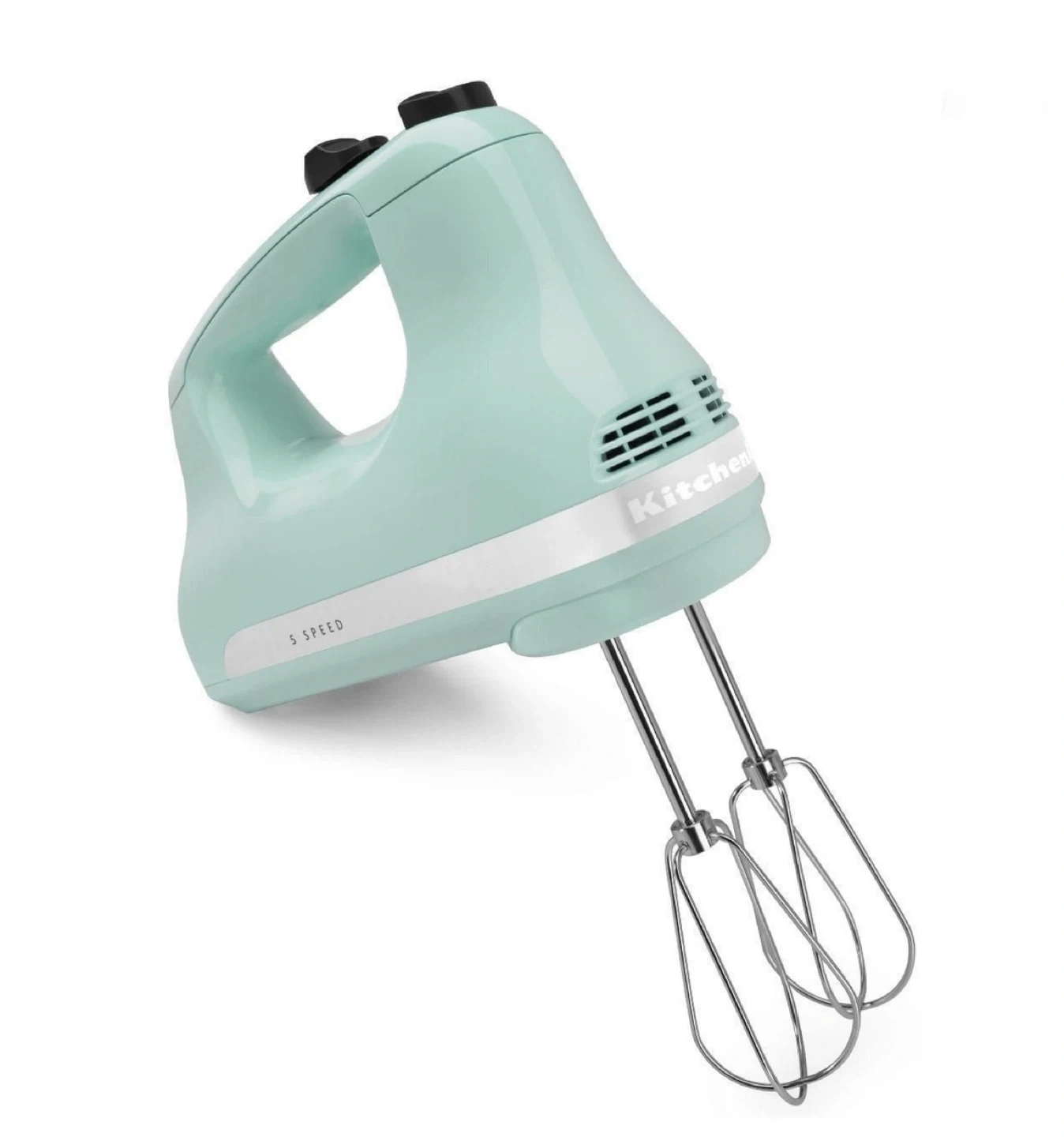KitchenAid 5-Speed Ultra Power™ Hand Mixer, Ice blue color. Bought recently, gently used. Looks like new only. > 5 Speeds. Mix ingredients for a variety of recipes from slowly stirring in chunky ingredients, like nuts or chocolate chips, at speed one to whipping egg whites or heavy cream at speed five. > Lock the Cord on Either Side While Mixing. Lockable swivel cord keeps the cord out of your way while mixing. > Beater Ejector Button. Easily and quickly remove any accessory from the hand mixer with the single-handed press of a button. > Stainless Steel Turbo Beater Accessories. Designed with no center post to thoroughly mix ingredients with less batter build-up. Dishwasher safe.