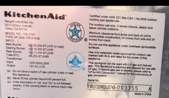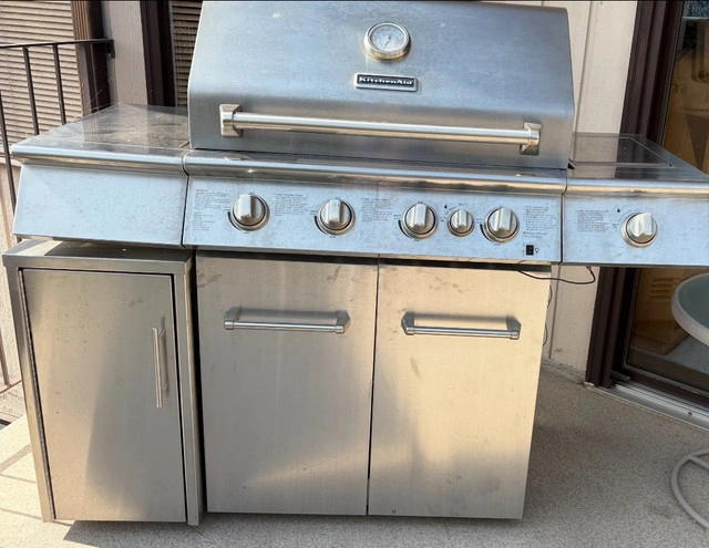 Upgrade your patio with this premium KitchenAid stainless steel barbecue! Features: - Heavy-duty stainless steel construction for long-lasting durability. - Large grilling area with multiple burners: 4 main burners (total 40,000 BTU), 1 searing burner (15,000 BTU), and 1 rear burner (13,000 BTU) for a total 68,000 BTUs of grilling power. - Convenient side burner for extra cooking options. - Spacious lower cabinet storage and side shelves for tools and prep. - Clean and well-maintained grilling surfaces ready for your next cookout. - Converted to natural gas. Perfect for family gatherings, hosting friends, or upgrading your outdoor kitchen. Contact for more details or to arrange a viewing!