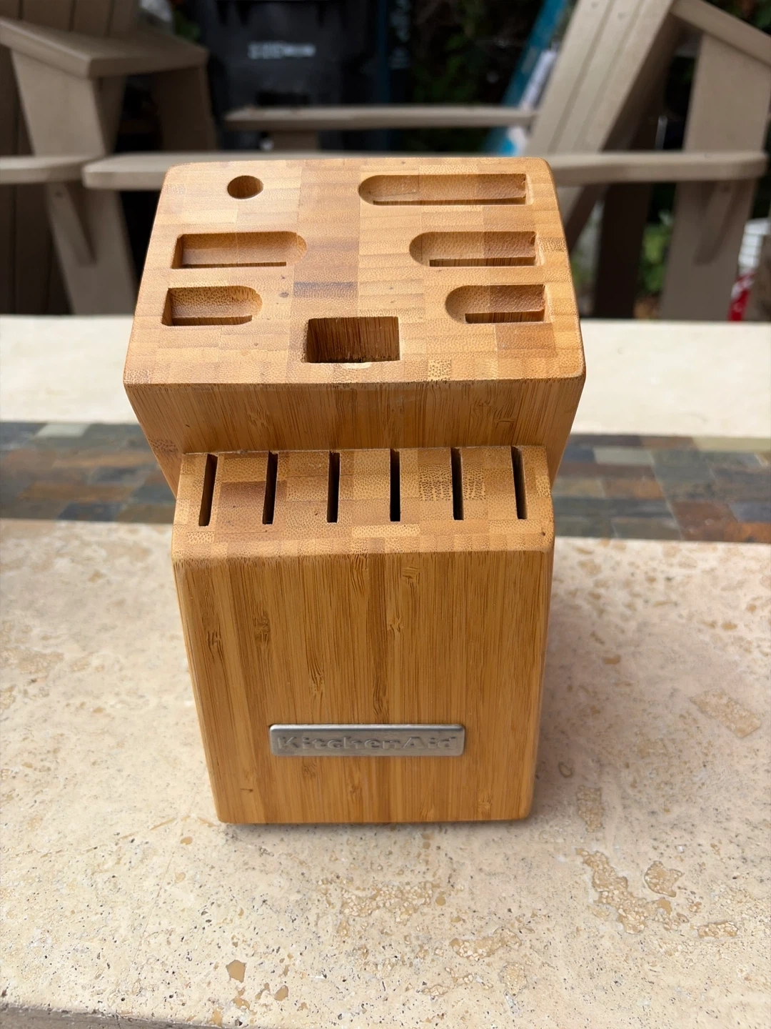 Free KitchenAid knife block in great condition! It's perfect for organizing your knives and keeping them safely stored. The block is made of wood and has slots for various knife sizes