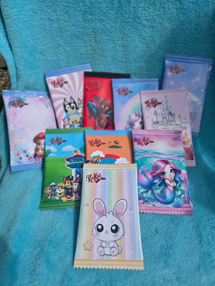 Kitkat wrappers for birthday parties and any events. ---- Customized with your favourite themes ---- Minimum order: a dozen $20/dozen without kitkat $34/dozen with kitkat bars ---- I do with other treats too. Please dm me for more details ---- Pick up at 95 115a