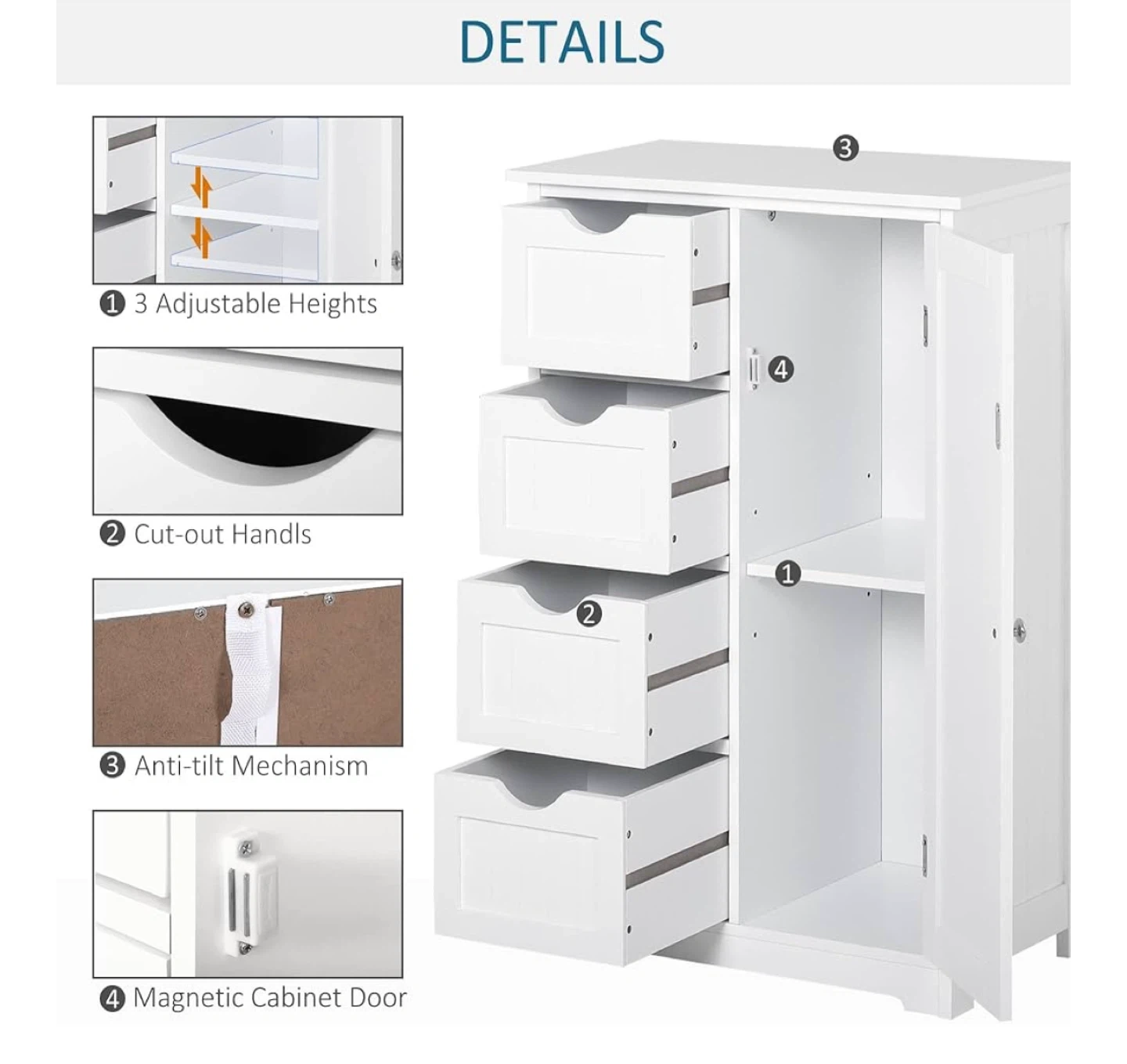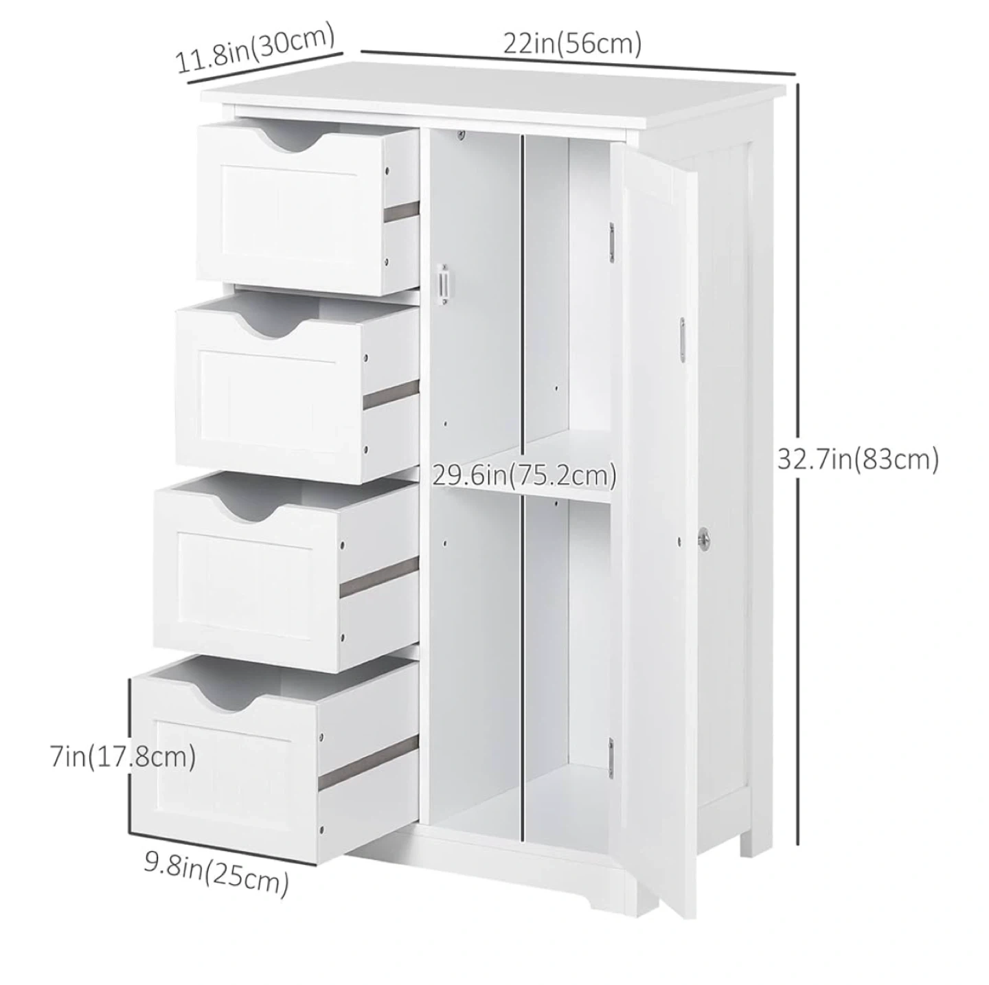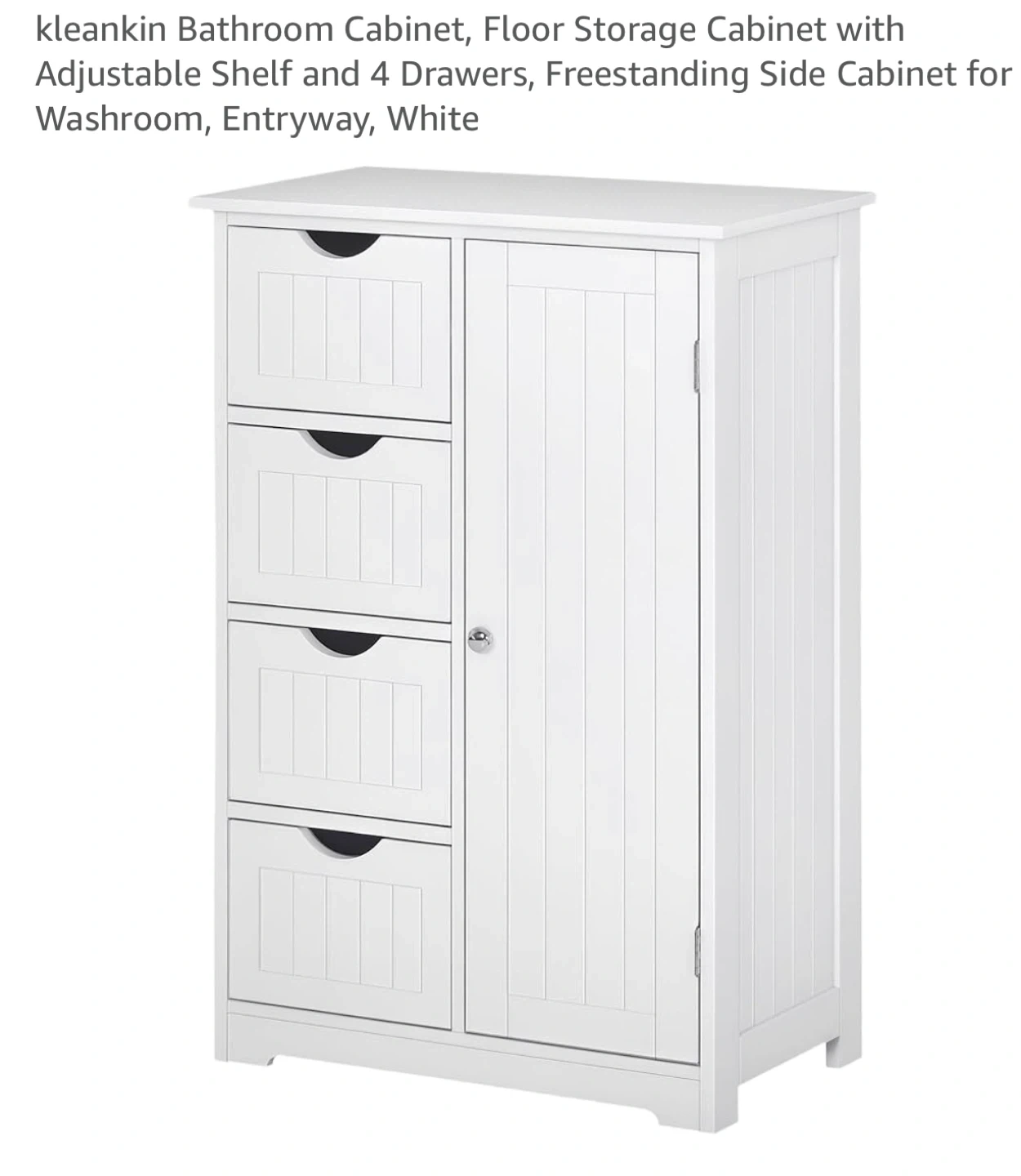 Looking to add some storage to your bathroom? This kleankin cabinet is perfect! It features an adjustable shelf, four drawers, and a freestanding design. The cabinet is white and has cut-out handles, an anti-tilt mechanism, and a magnetic cabinet door. Dimensions: - 11.8in (30cm) width - 22in (56cm) length - 32.7in (83cm) height - Drawer height: 7in (17.8cm) - Drawer depth: 9.8in (25cm) - Shelf height: 29.6in (75.2cm) 2 BRAND NEW in box unopened available for sale. $85 each