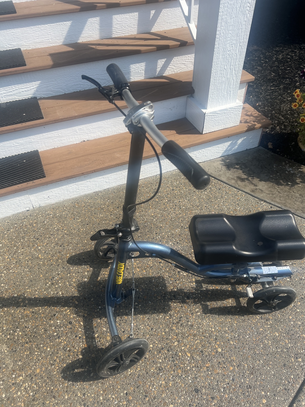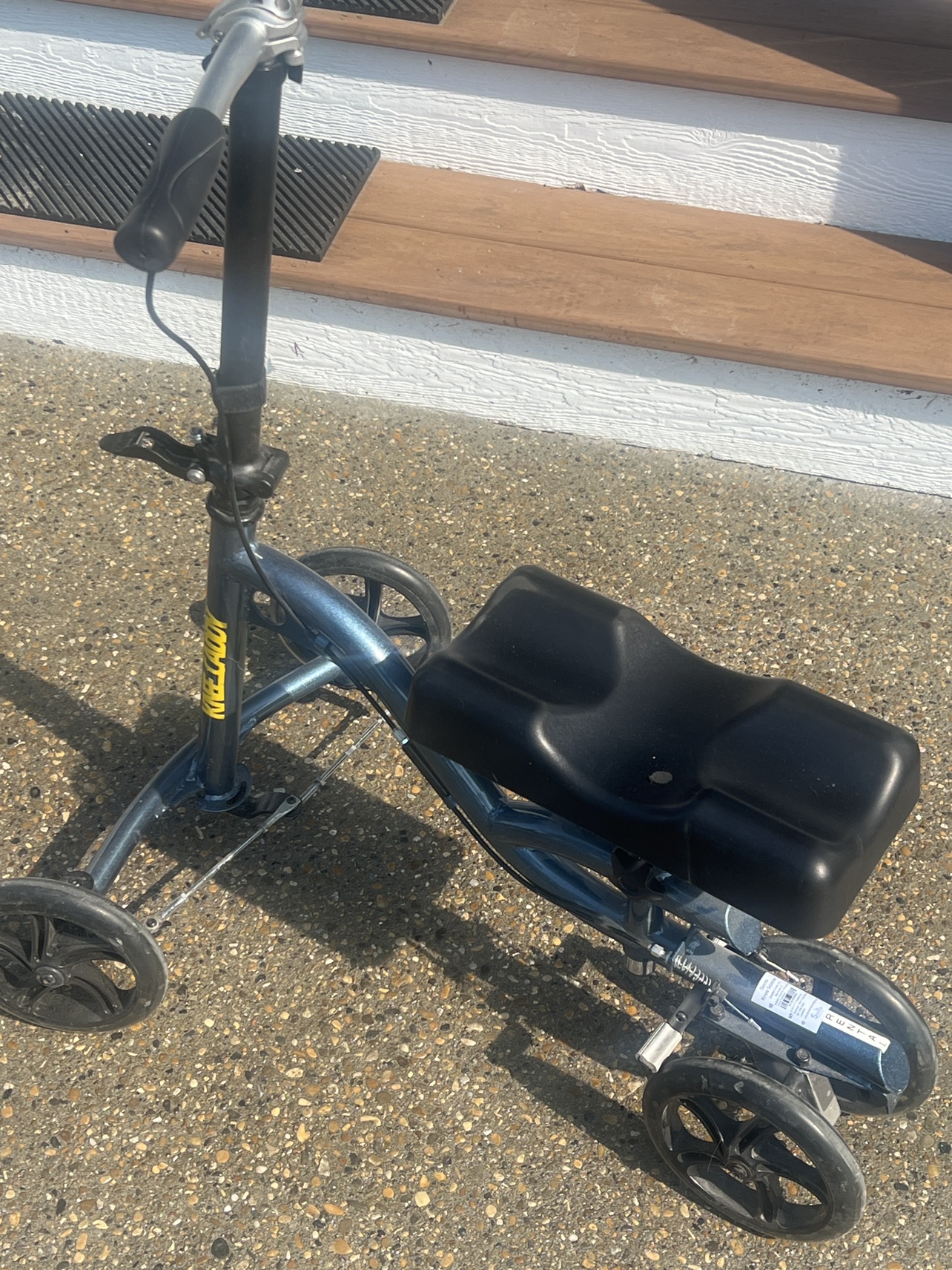This knee scooter has a padded seat. It is blue and black in colour. It folds for storage and transportation.
