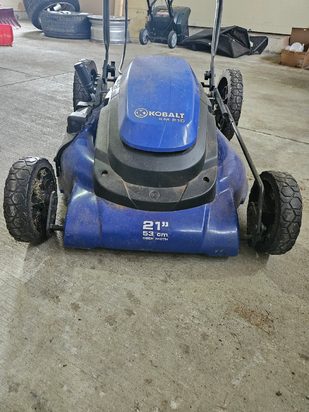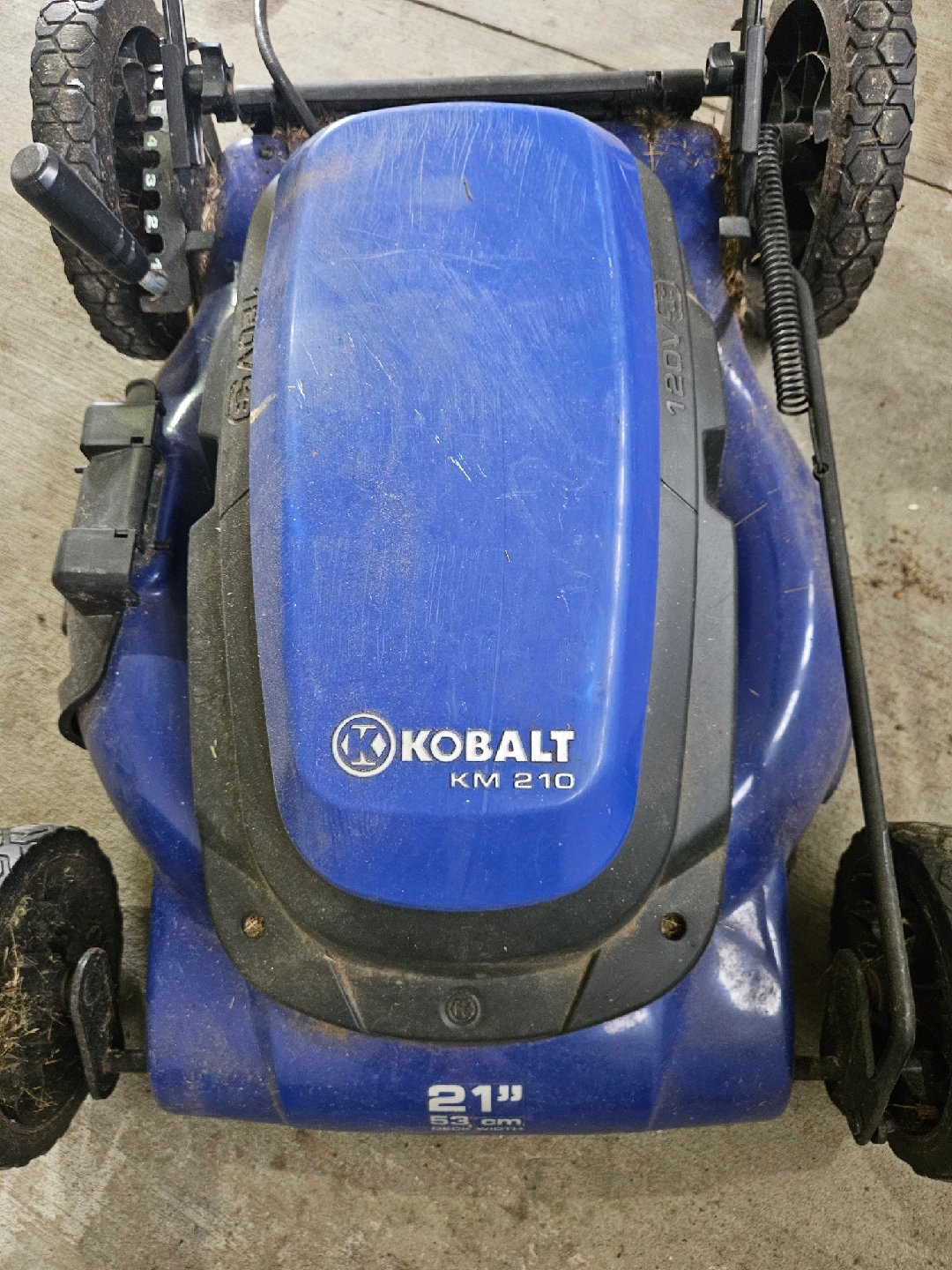 Selling a Kobalt KM 210 cordless lawn mower. It has a 21-inch cutting deck. Great for maintaining a small to medium-sized lawn. Ready to go to a new home!