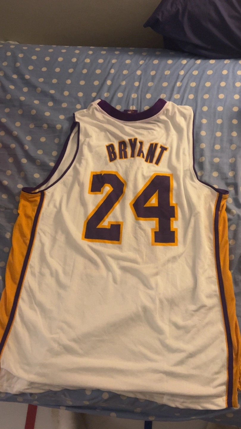 Selling a Kobe Bryant Lakers jersey, number 24. It's white with purple and gold accents. Great for any Lakers fan!