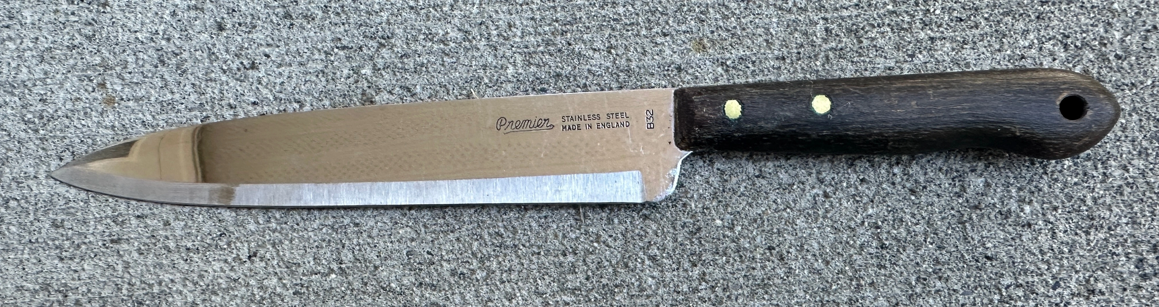 This Premien Stainless Steel Made in England B32 knife is in great condition. Blade is 6-1/2", wood handle is 41/2". Not sure if this is the correct sleeve, this is how I got it.