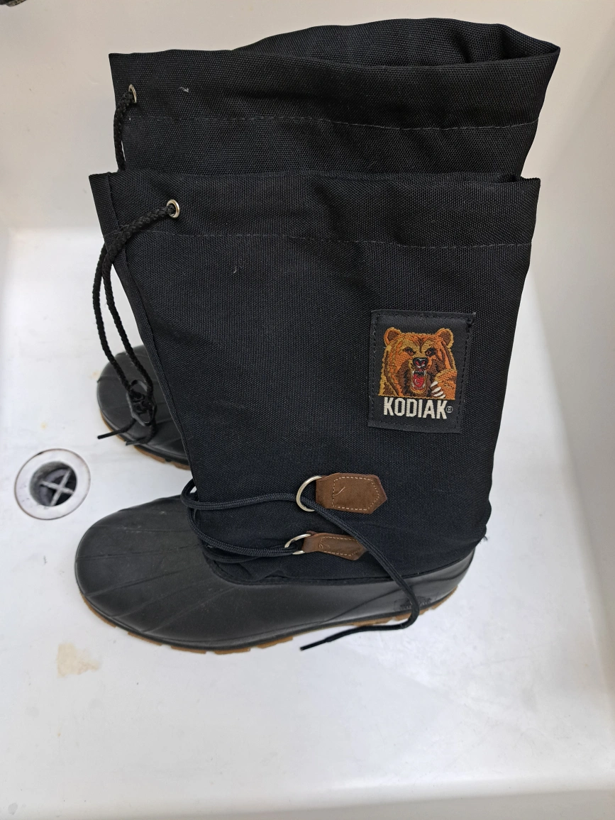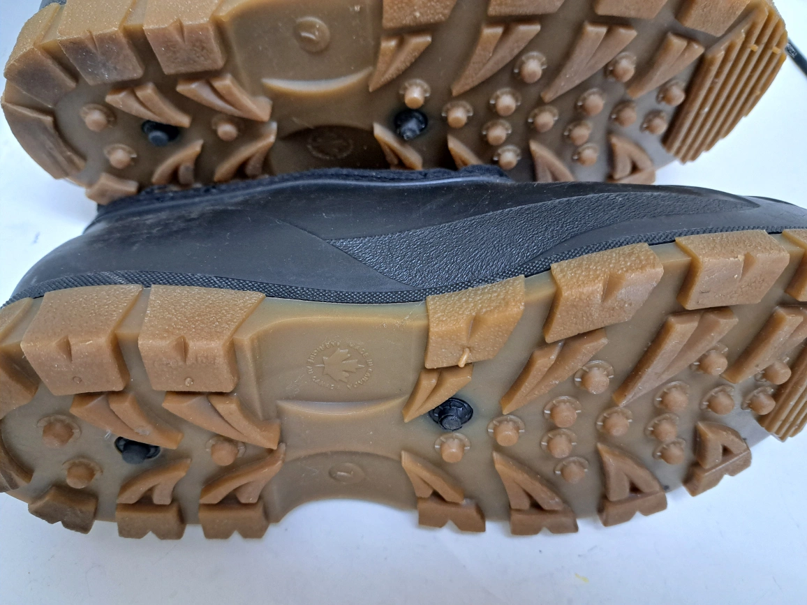 Black winter boots. Lace-up style with a rubber sole. Good condition. Sole has 2 metal ice picks built into sole.