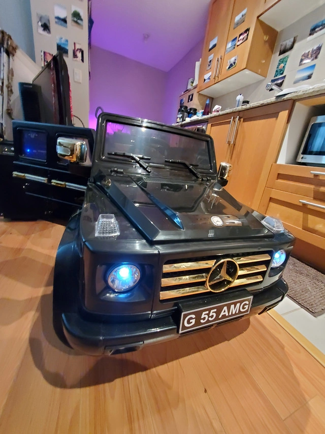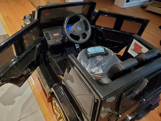 Selling kid's ride-on car Mercedes G55 AMG Limited Edition in Black/Gold. Everything works perfectly, comes with 12V battery, like new: - Remote control for parents - Key start - MP3 AUX - Seatbelt - Lights and sounds Kool Karz brand, licensed by Mercedes. Text 778-718-3204 Pickup in Burnaby Asking $450