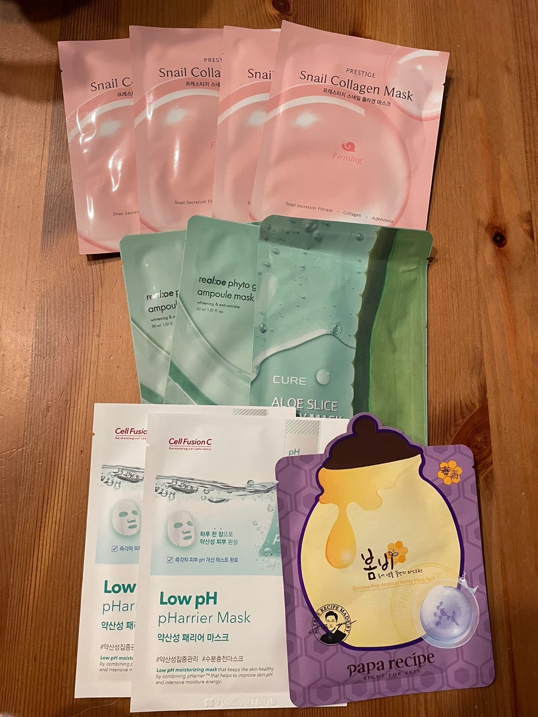 A collection of various face masks to try out! Includes: - PRESTIGE Snail Collagen Mask (Firming) - real:oe phyto g ampoule mask (whitening & anti-wrinkle) - CURE ALOE SLICE - Cell Fusion C Low pH pHarrier Mask - Papa Recipe Bombee Pore Ampoule Honey Mask Pack 10 pcs
