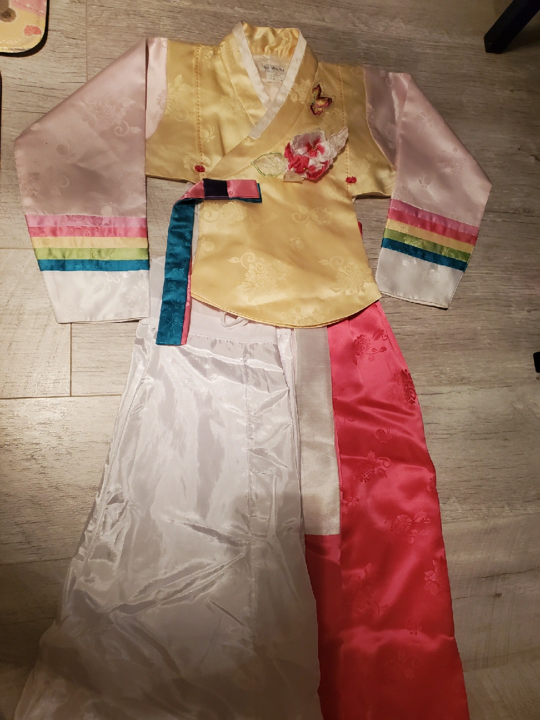 Selling a traditional Korean Hanbok dress in good condition! The tag indicates it's a size 9. The dress features a beautiful combination of colours and floral patterns.