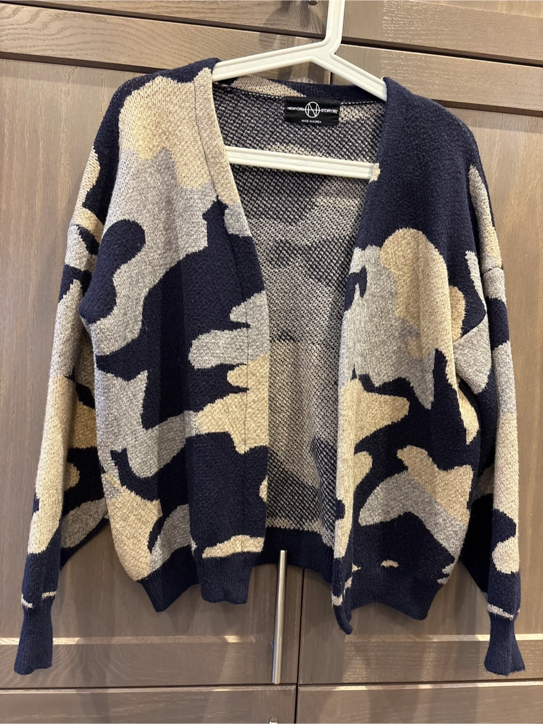 Selling a Newyork Story392 cardigan with a unique camo pattern! It's in great condition Made in Korea Waist 105cm Length 57cm