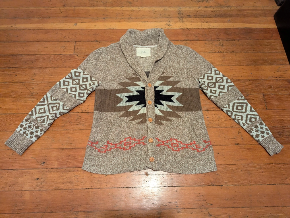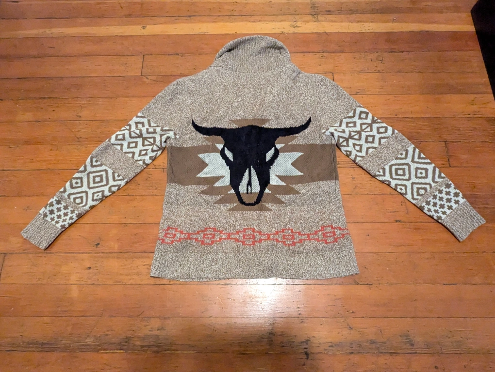 KOTO Aztec Tribal Cardigan Sweater. Southwestern Bull on the back. Cotton Wool blend. Size medium. Would fit women's large and men's small/ medium. Pick up in the West End of Vancouver