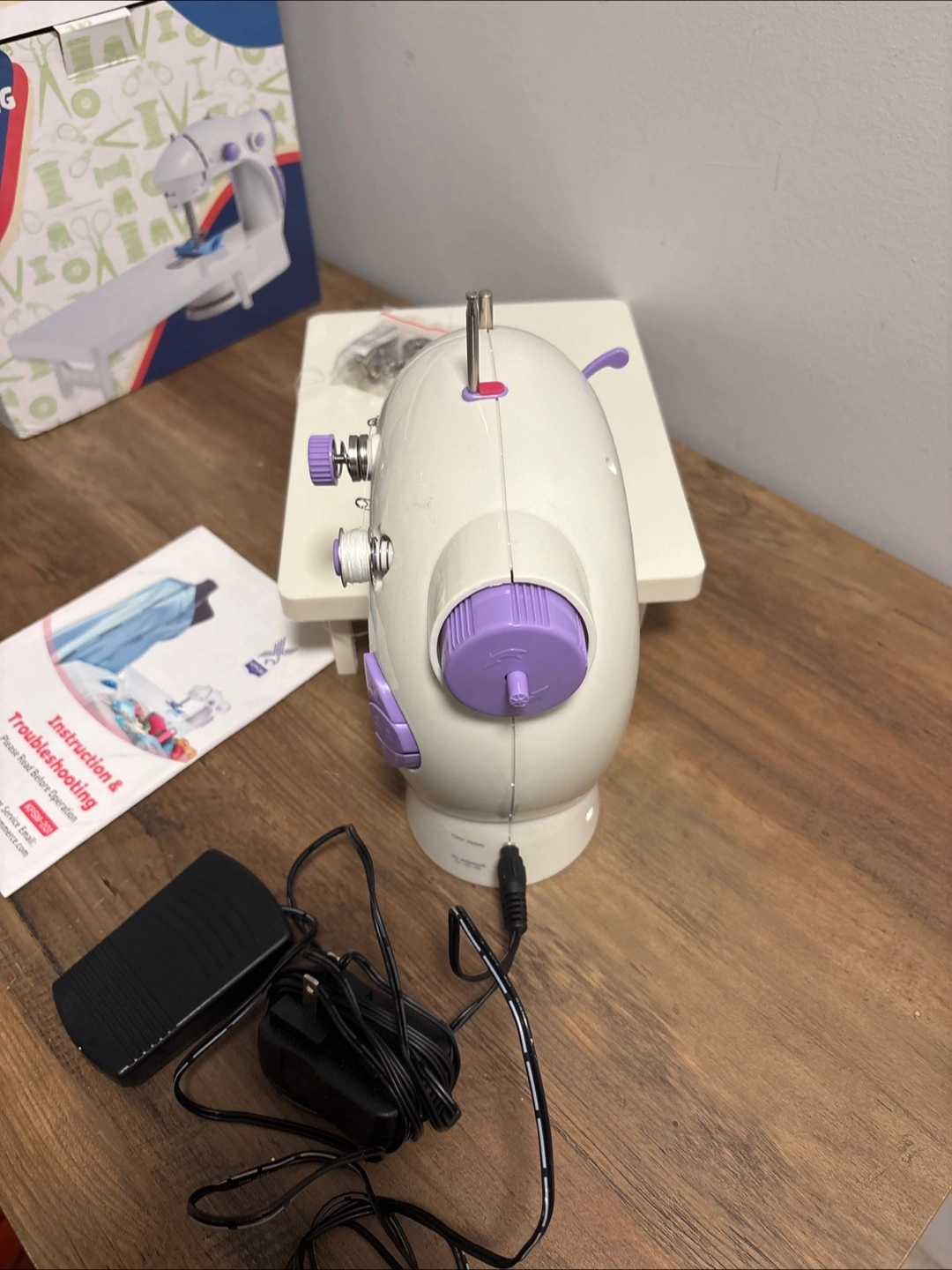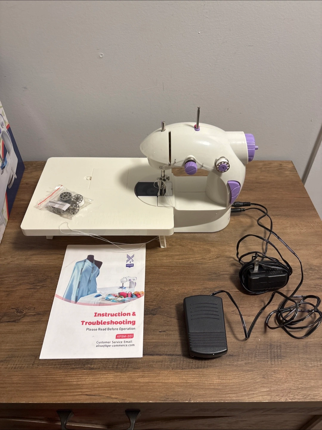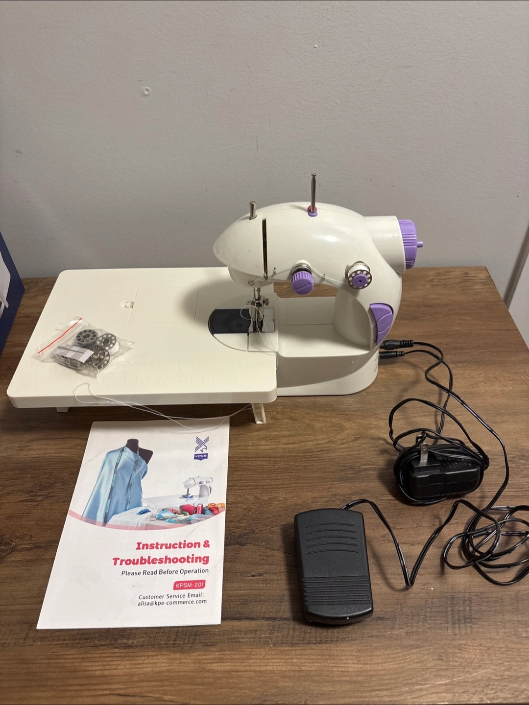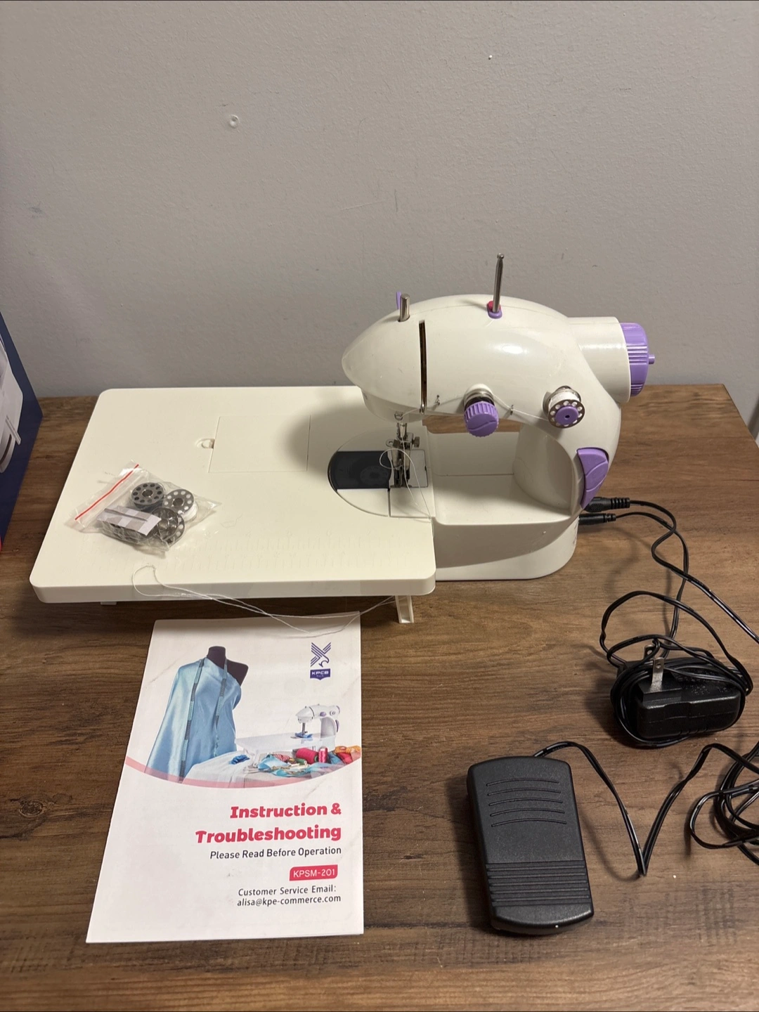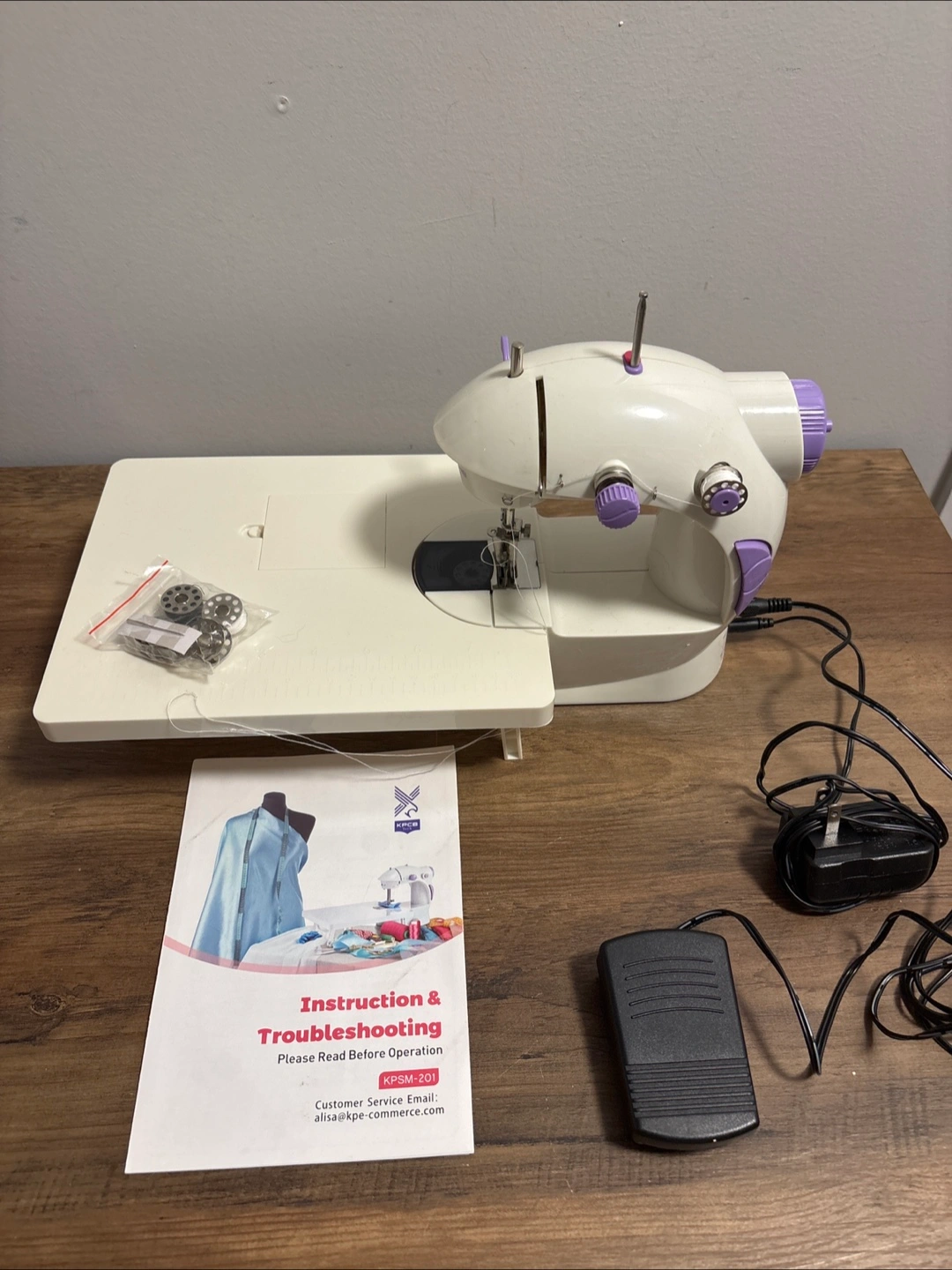 Selling a KPCB Tech mini sewing machine in excellent condition! It looks like it's never been used. It's portable, convenient, and cost-effective. Comes with the original box and instructions, plus the foot pedal and some extra bobbins