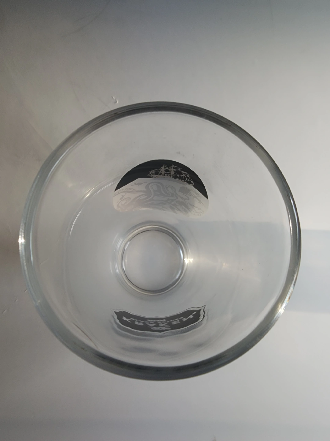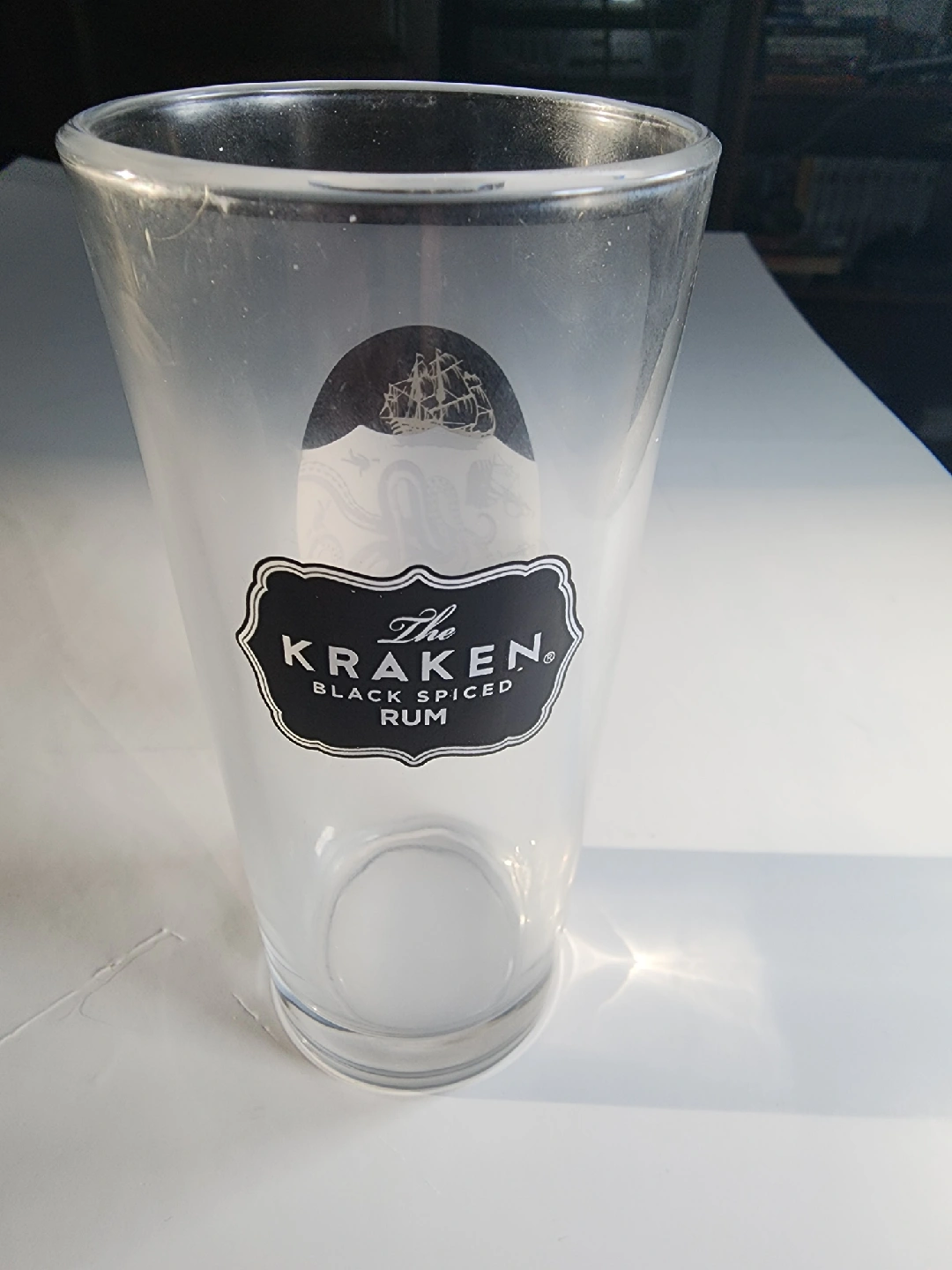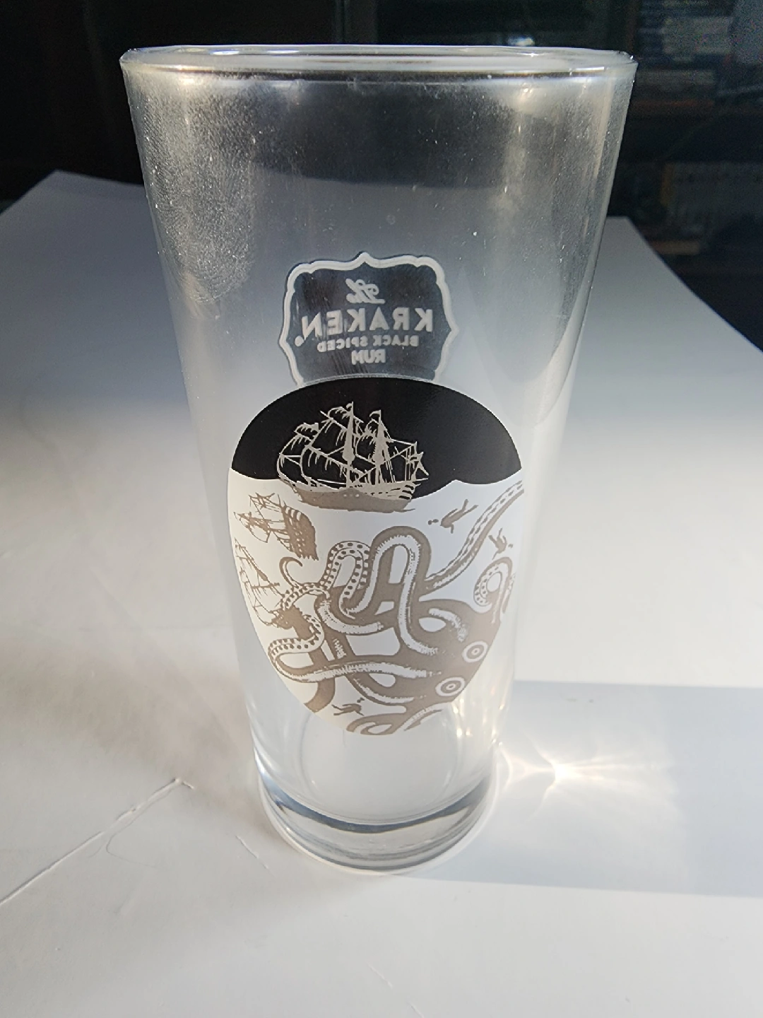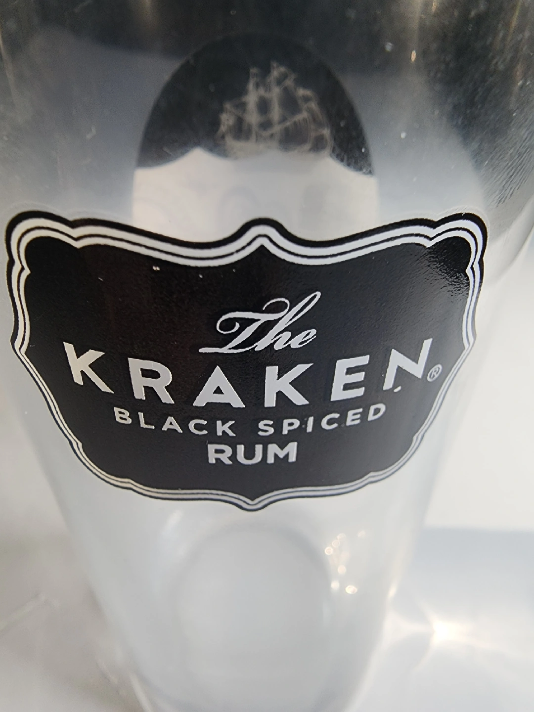 Selling a Kraken Black Spiced Rum glass! It features the Kraken logo with a ship and octopus design. Perfect for your home bar or as a gift for a Kraken fan