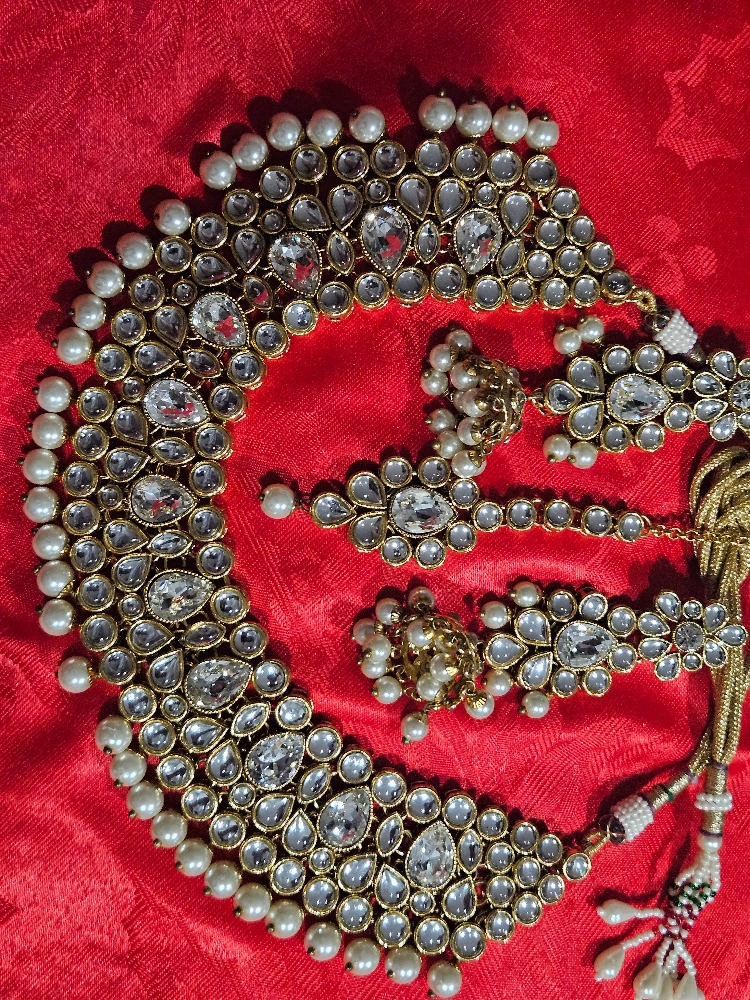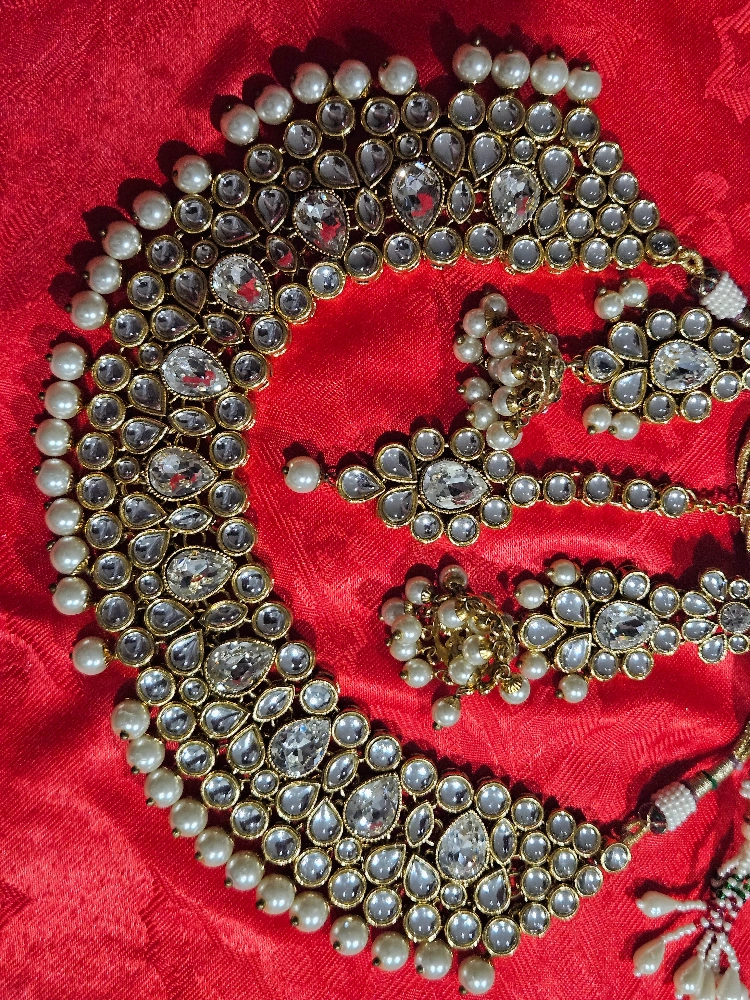 Beautiful necklace and earring set with faux pearls and clear stones. Perfect for a special occasion or to add a touch of elegance to any outfit!