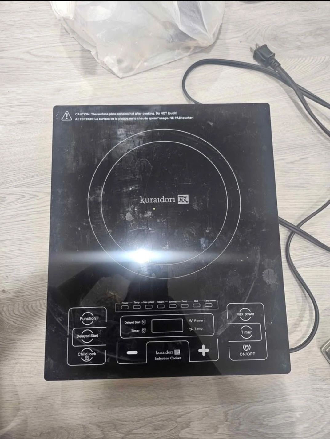 Selling a Kuraidori induction. It has a variety of functions including power, temp, timer, delayed start, and child lock. It shows signs of use.