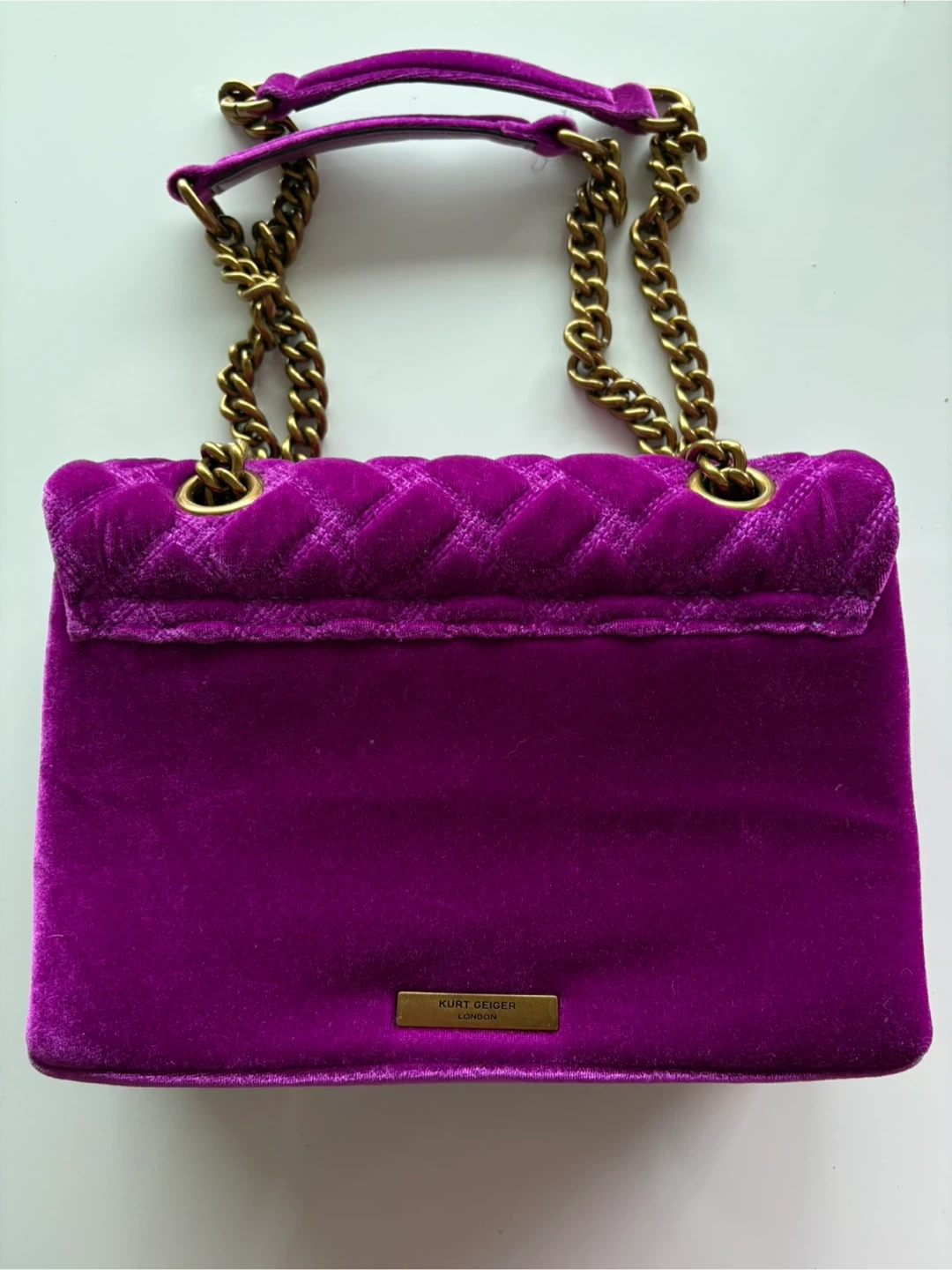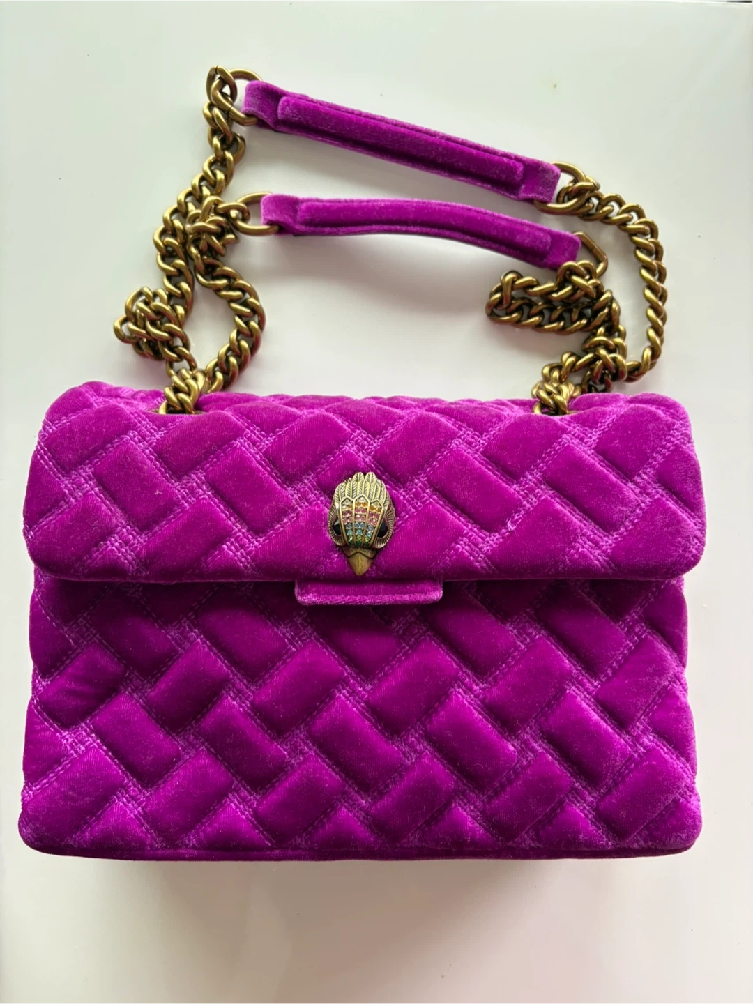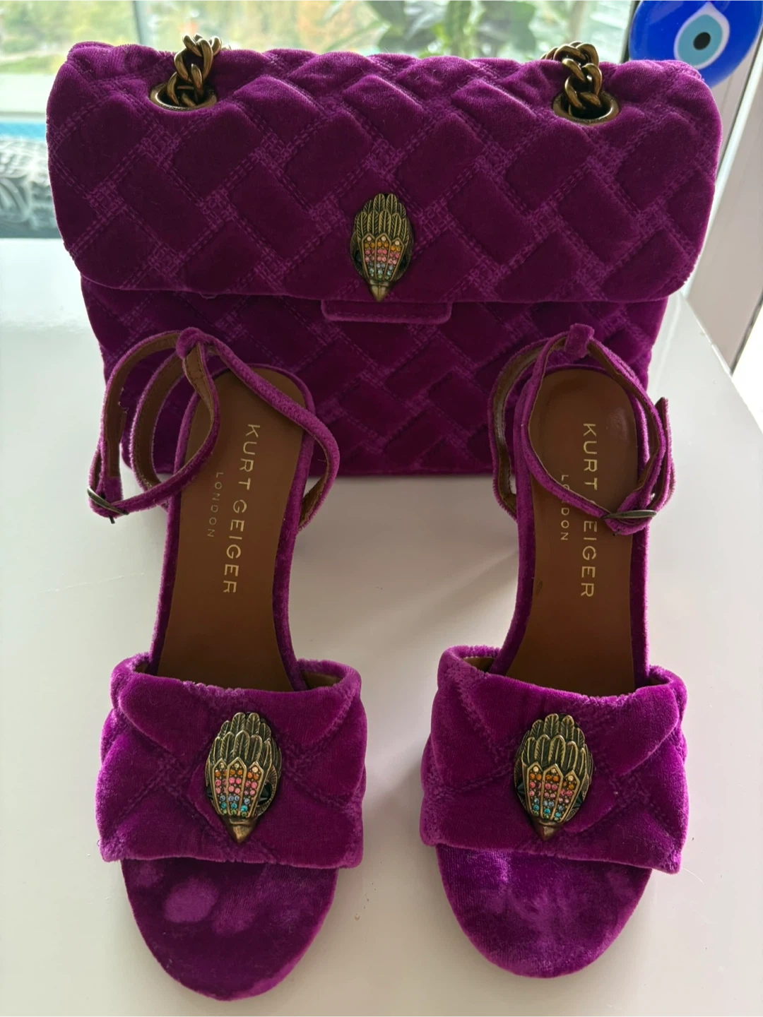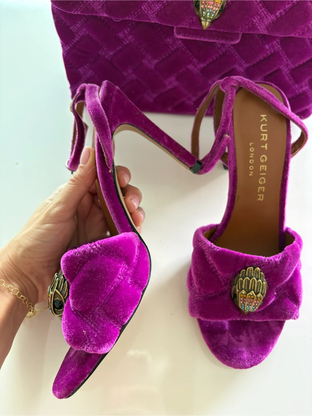 Selling a matching Kurt Geiger London set! This includes a beautiful purple velvet handbag with a gold chain strap and a pair of matching heels in size 36. Both items feature the signature Kurt Geiger eagle head emblem. Great for a night out or a special occasion!