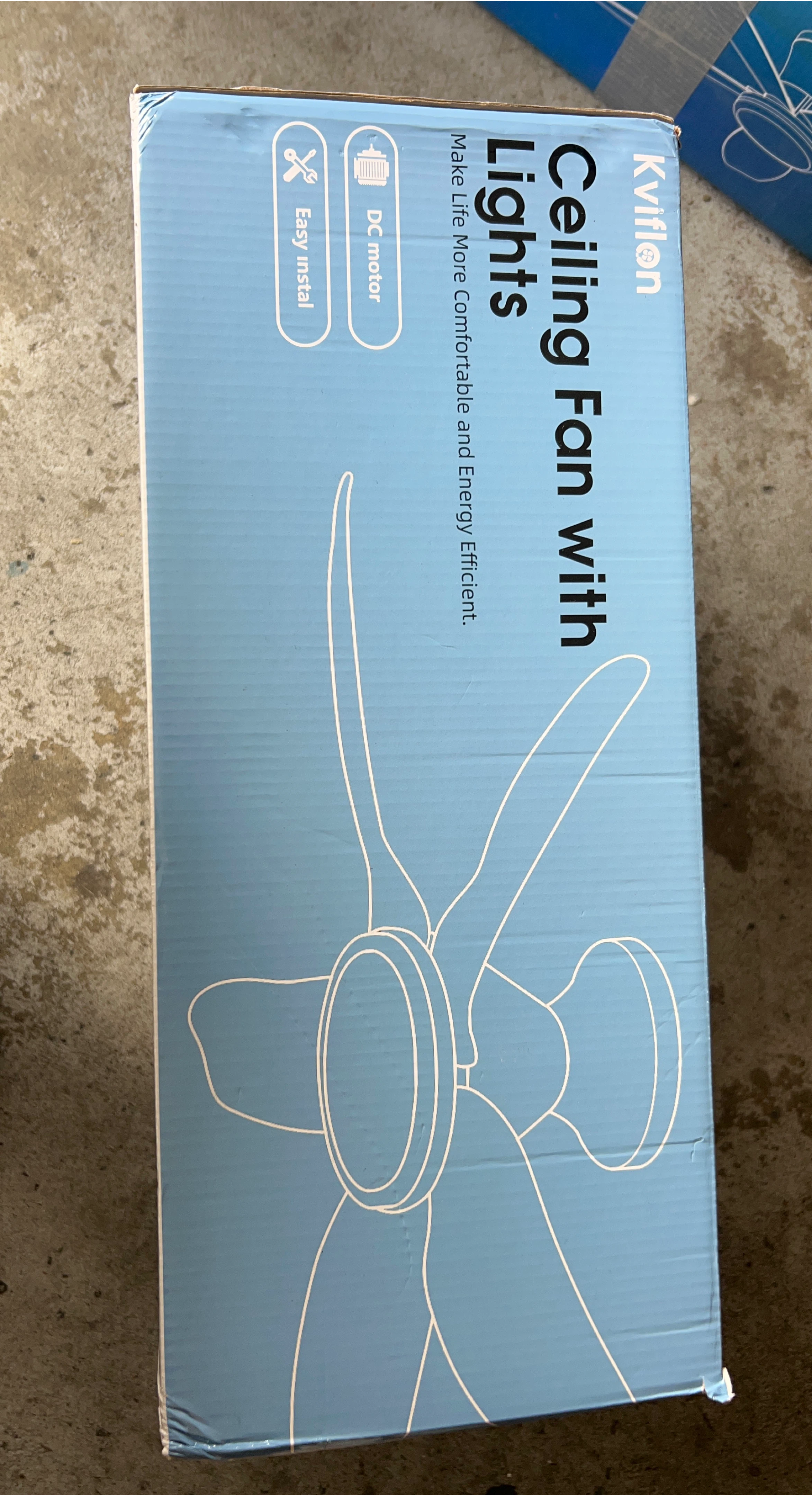 Selling a brand new Kviflon ceiling fan with lights, still in its original packaging! It's designed to make life more comfortable and energy-efficient. Features include a DC motor and easy installation, so it's a breeze to set up