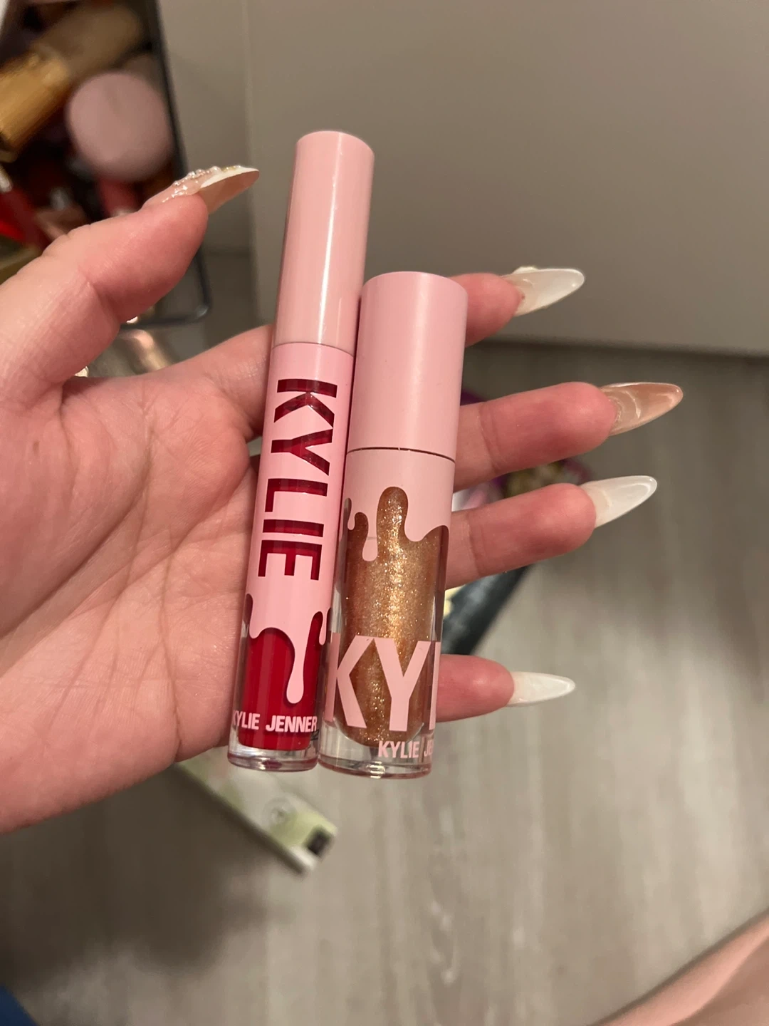 Selling a Kylie Jenner lip gloss set. One is a red lip gloss and the other is a sparkly gold lip gloss! They're both in great condition and ready for a new home