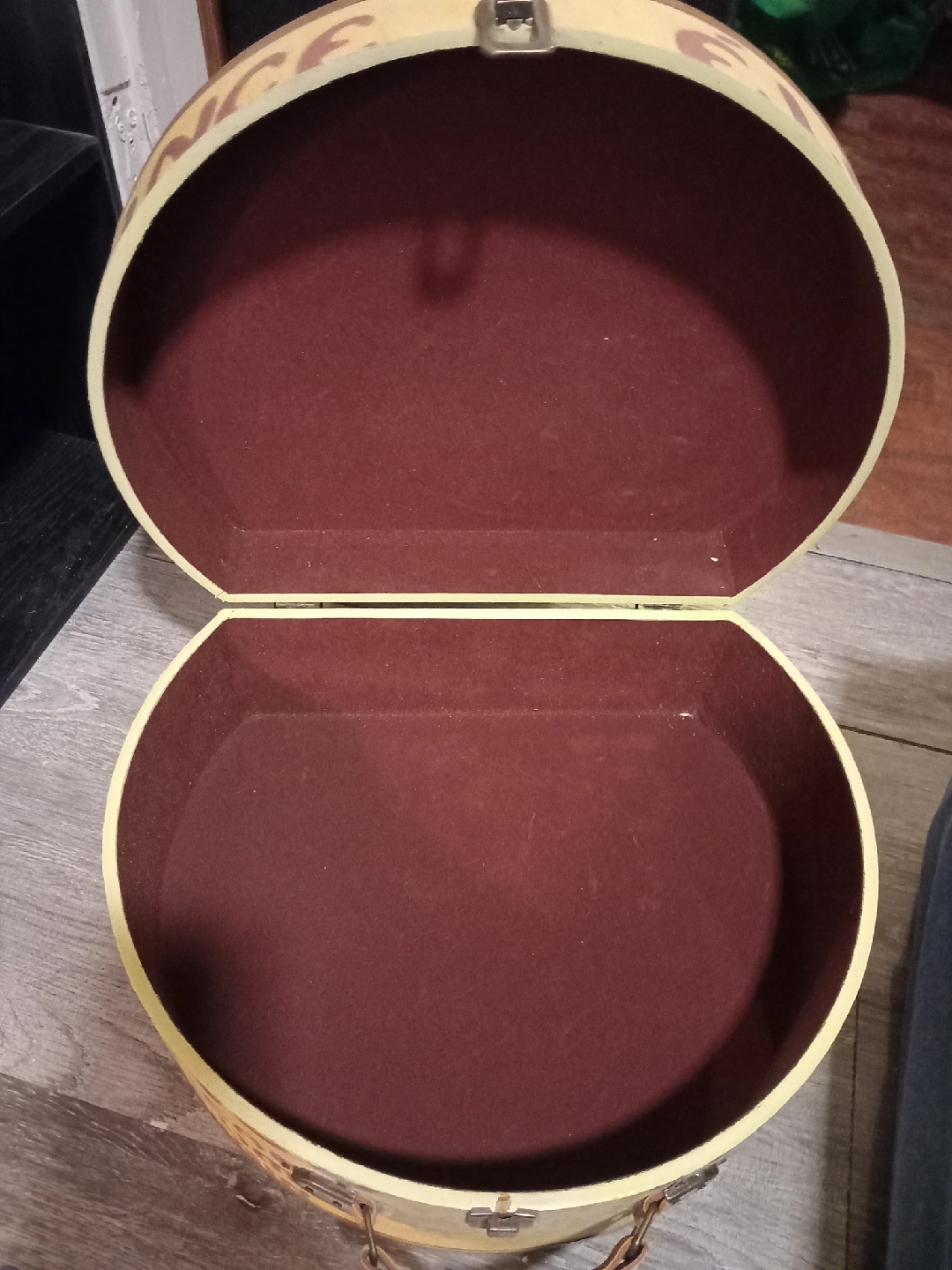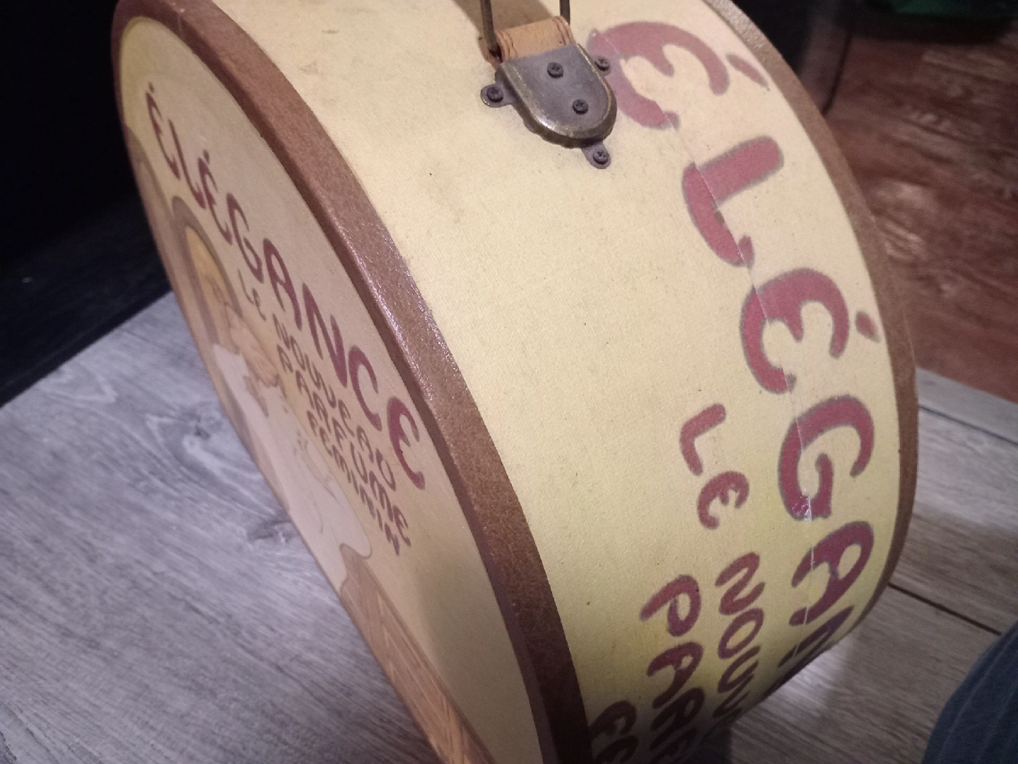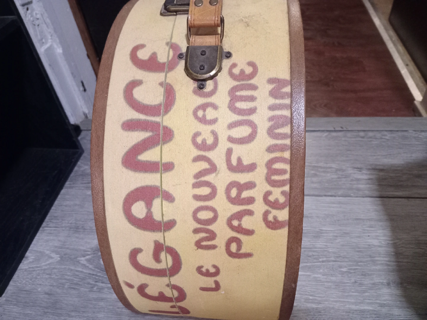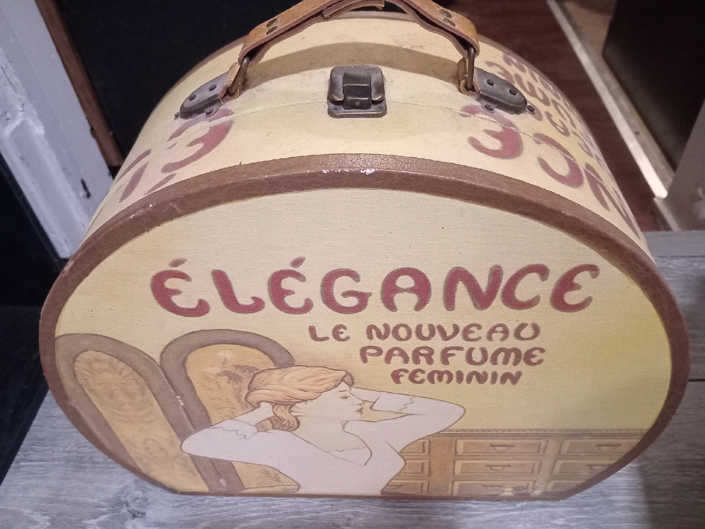 Selling a vintage-style Élégance case. It features a unique design with the words "Élégance Le Nouveau Parfume Feminin" printed on the side. The interior is lined with a soft, maroon-coloured fabric. Perfect for adding a touch of retro charm to your space! Asking $85