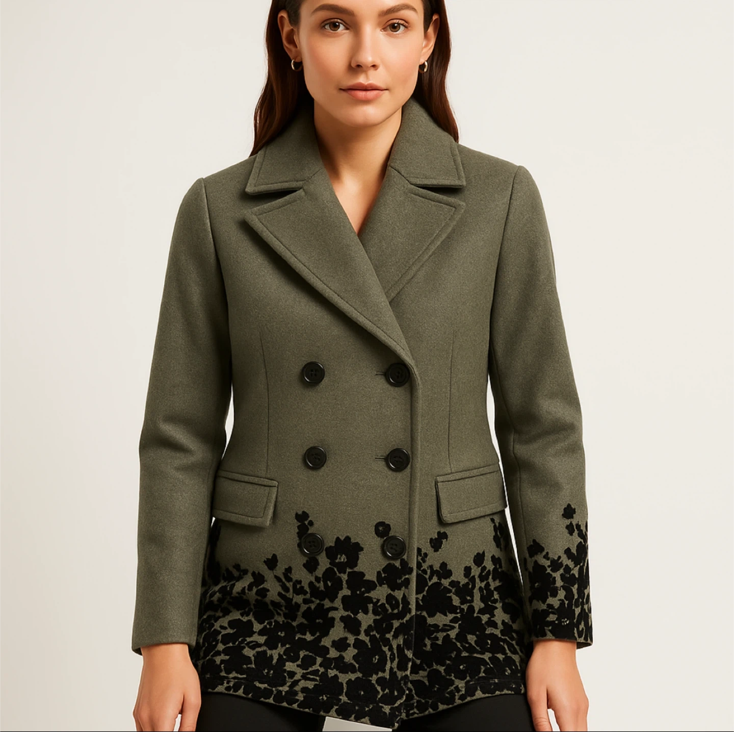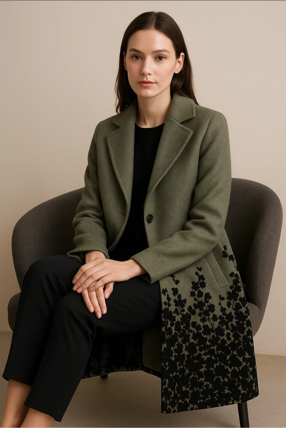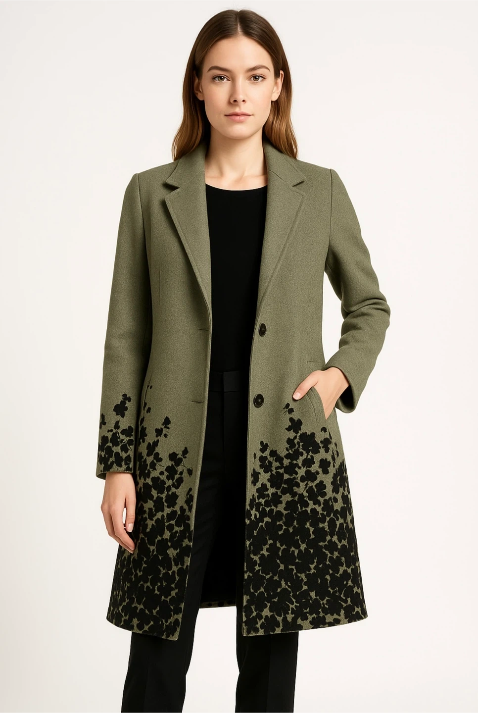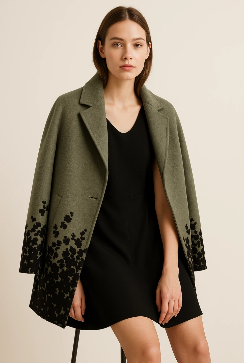 Élégant manteau pour femme en laine mélangée, couleur vert kaki avec motifs floraux noirs brodés en bas.Tres jolie , propre porté que 2 fois uniquement. Le prix est négociable .
