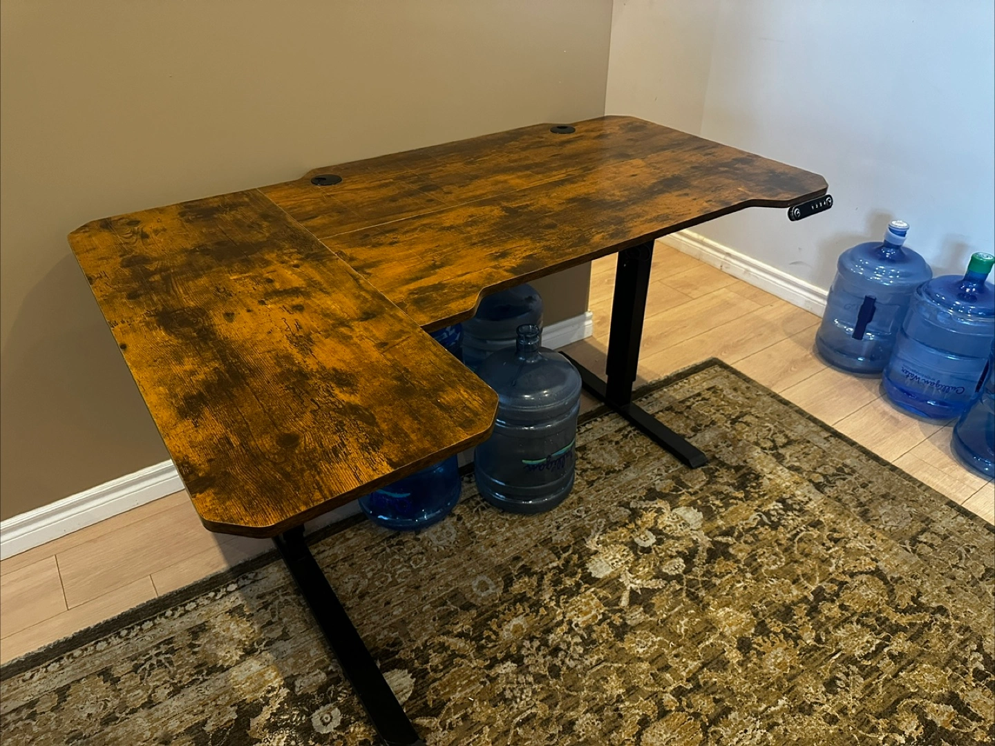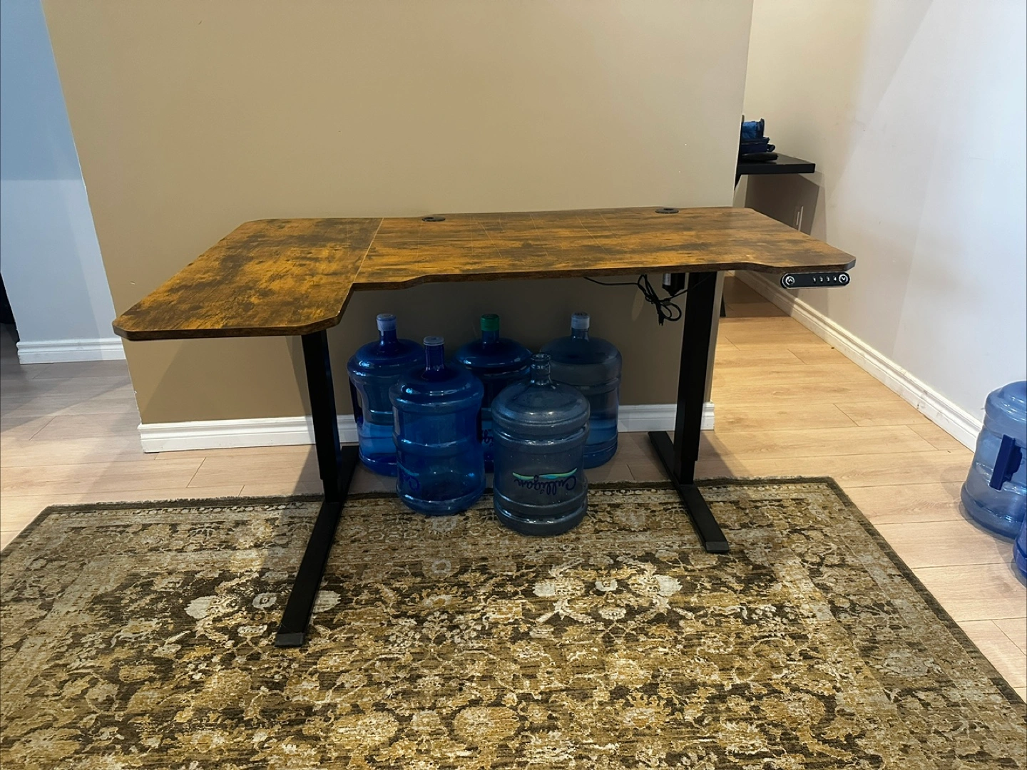 Selling an L-shaped adjustable height desk. The desk has a wood-look finish with black legs. It's in great shape and ready for a new home! Perfect for a home office or gaming setup Motor is burned out, replacement motor available through Amazon