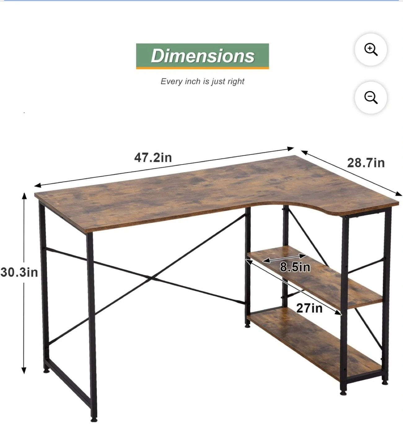Looking to sell my L-shaped corner desk! It's in great condition and perfect for a home office or study space. The desk features convenient shelves for storage, helping you keep your workspace organized. Dimensions: - 47.2 inches (length) - 28.7 inches (width) - 30.3 inches (height) - Shelf depth: 8.5 inches & 27 inches