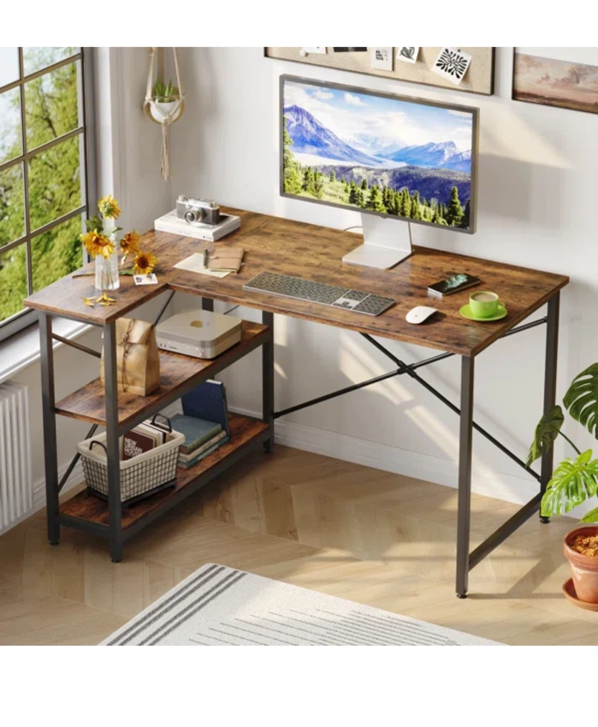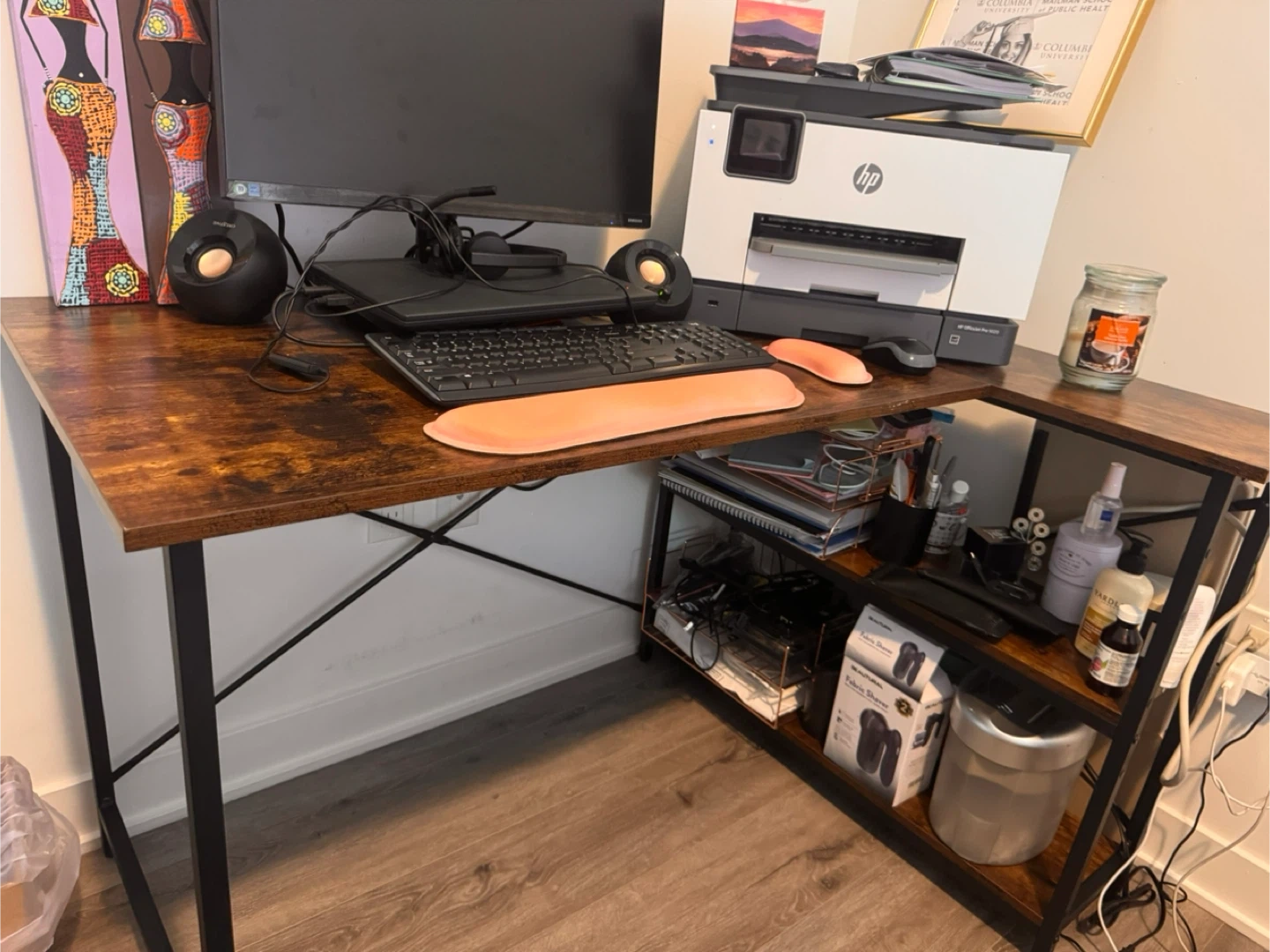 Looking to sell my L-shaped corner desk! It's got a rustic brown finish and a sturdy black metal frame. There are shelves on one side for storage, perfect for books or office supplies. It's in great condition and would be a fantastic addition to any home office or workspace