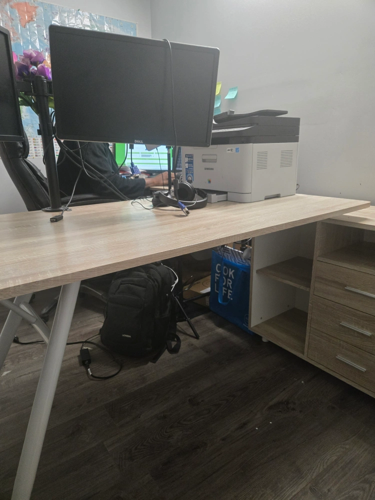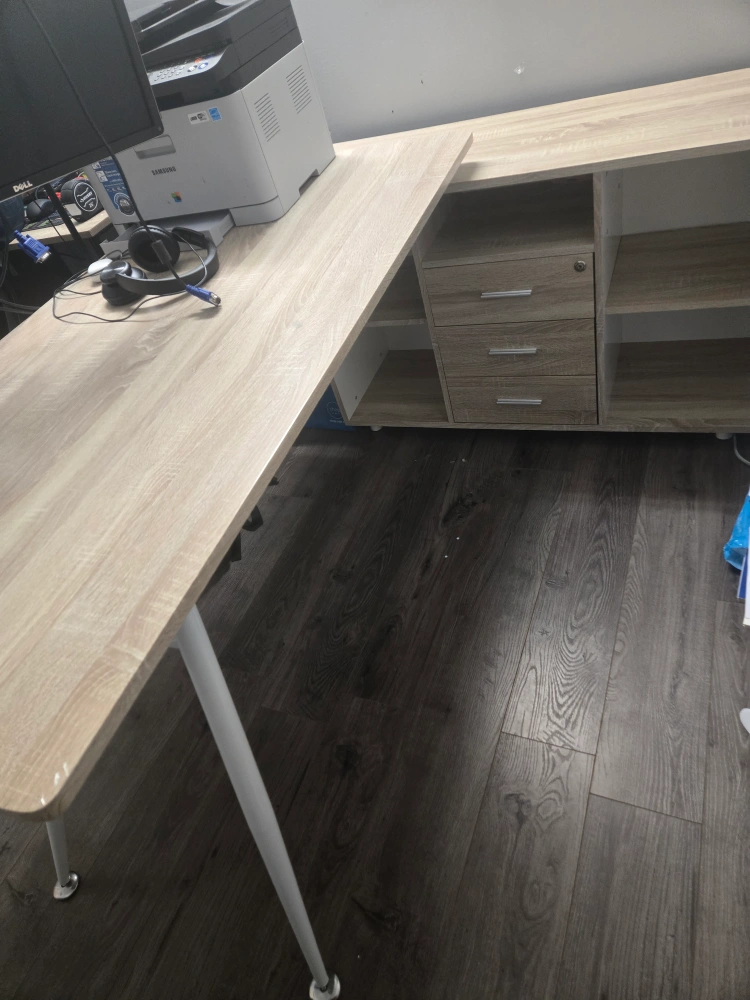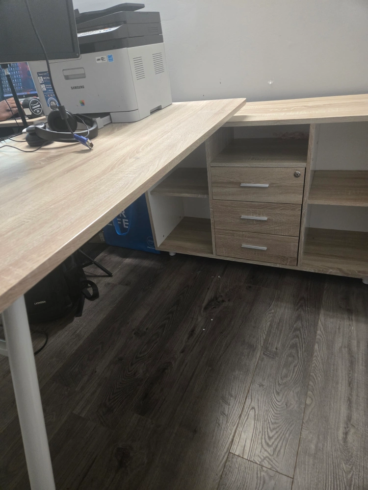 Selling a spacious L-shaped desk, perfect for a home office or study area! It comes with built-in storage shelves and drawers to keep everything organized. The desk has a light wood finish and white legs. It's in great condition and ready for a new home!