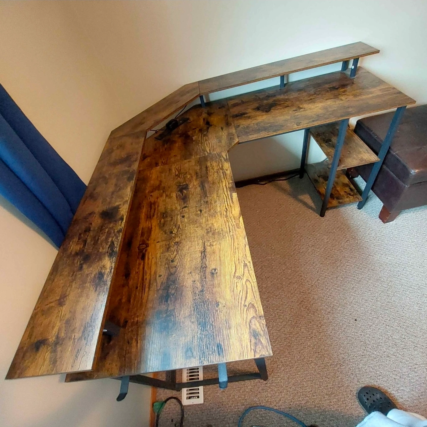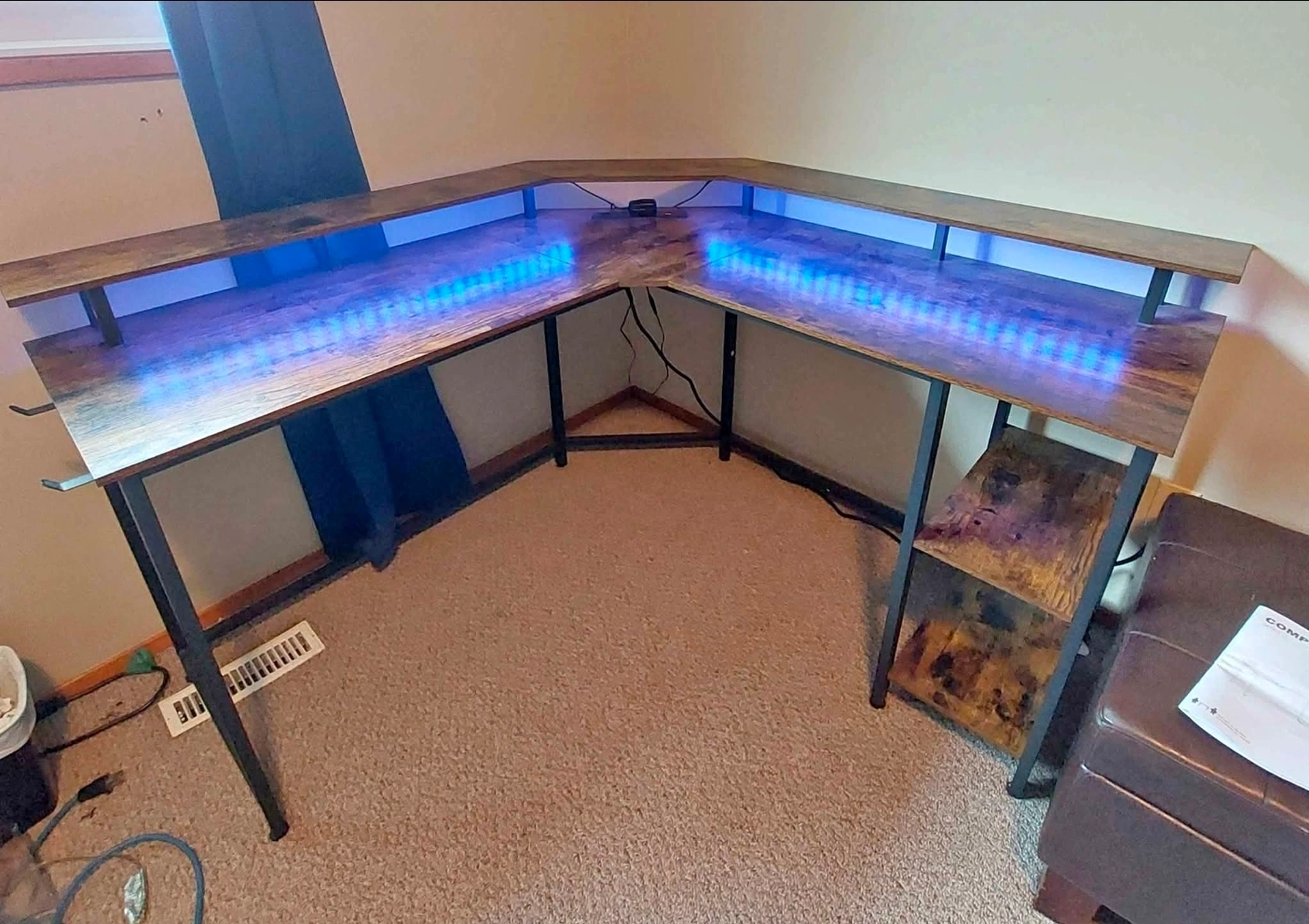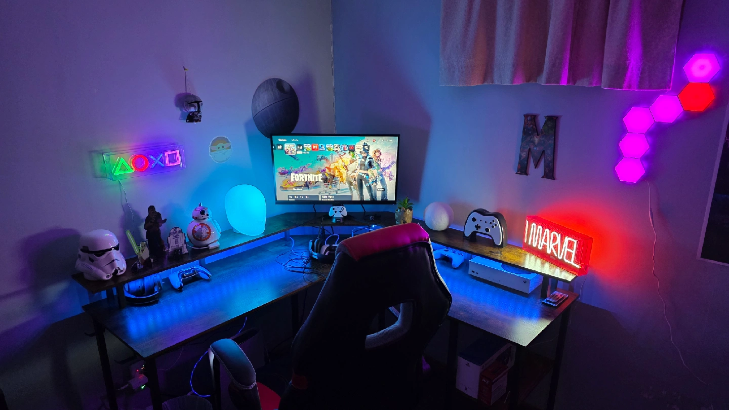 Selling an L-shaped gaming desk in great condition! It features built-in LED lights that add a cool vibe to your gaming setup. The desk also has a convenient power outlet for your devices. Perfect for creating an immersive gaming experience or a productive workspace